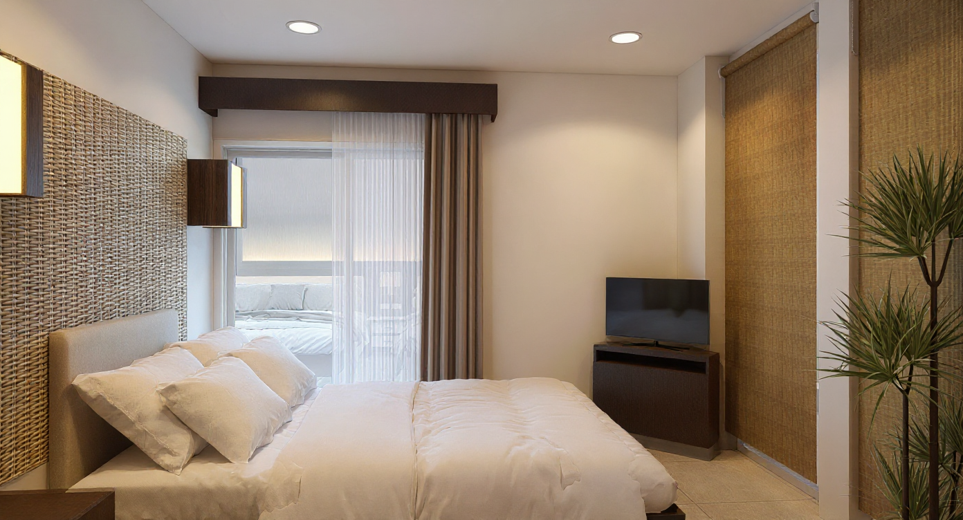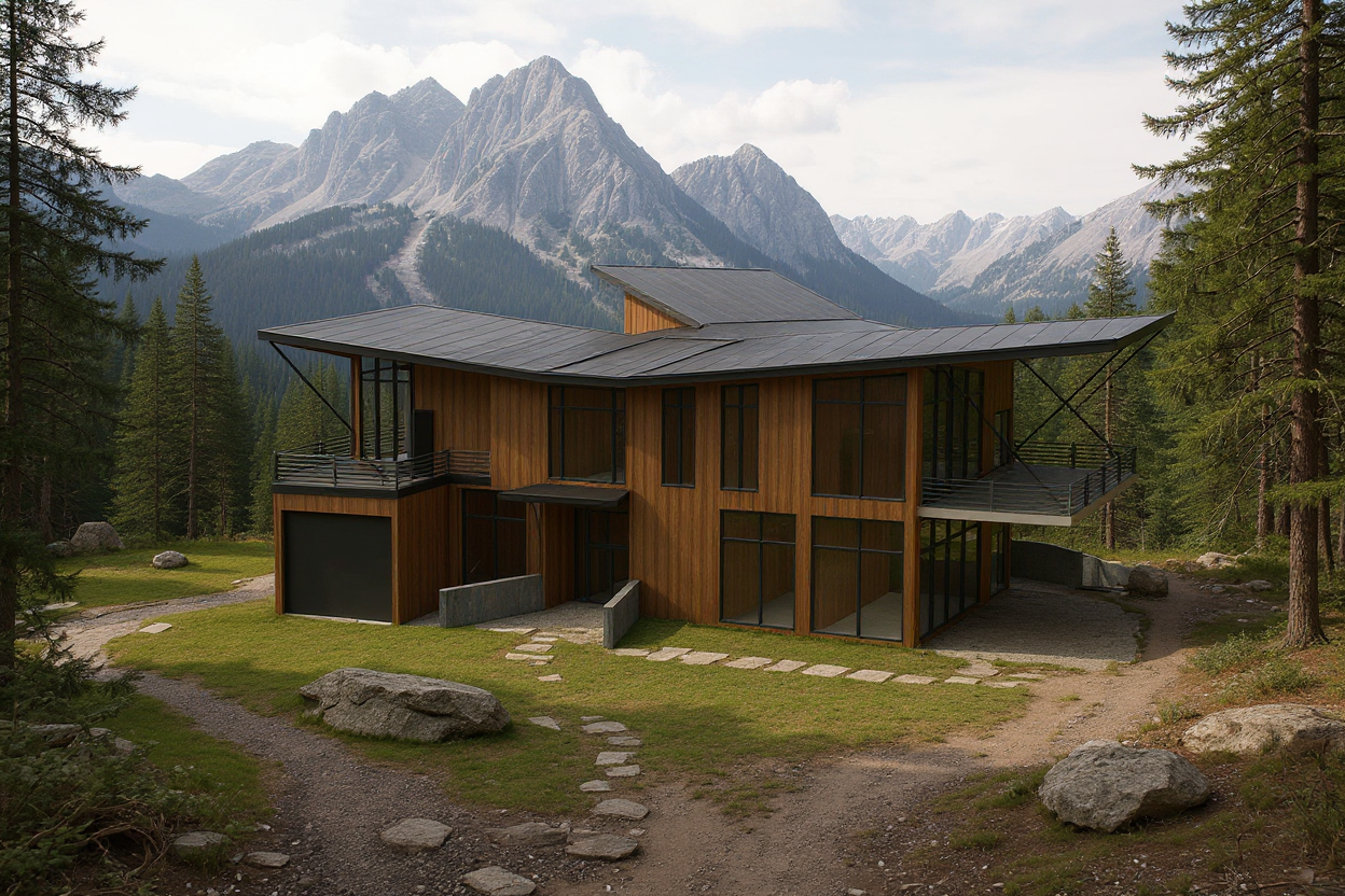 archsynth render using a high top down drone angle directly above the site keep the exact 3d building geometry and arrangement unchanged enhance dense forest vegetation surrounding the tent roof buildings show the narrow road clearly in front of the site reveal the small river flowing along the lower slope with natural rocks and greenery maintain natural daylight and high resolution forest canopy textures