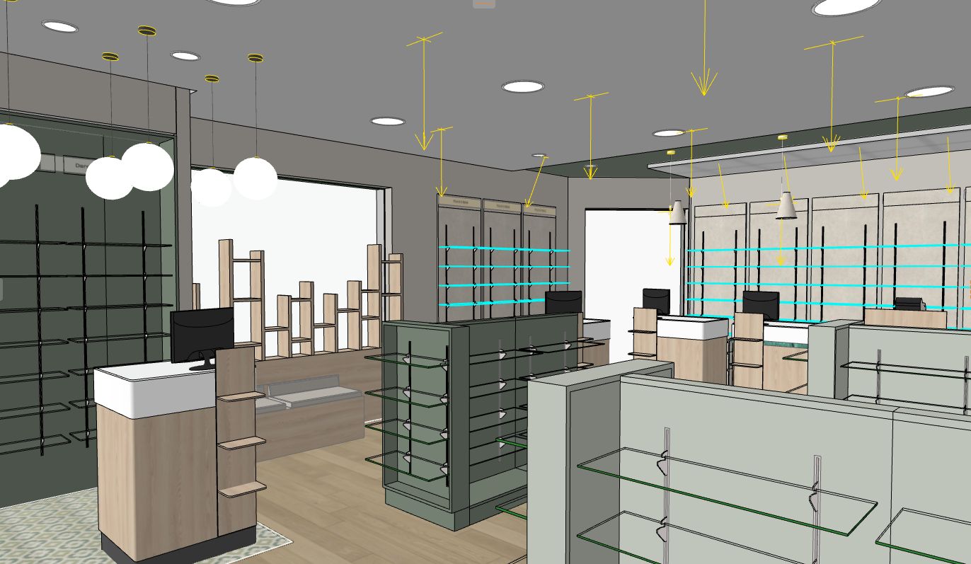 pharmacy interior manteine similar colors downlghits and celling projectors for walls put products