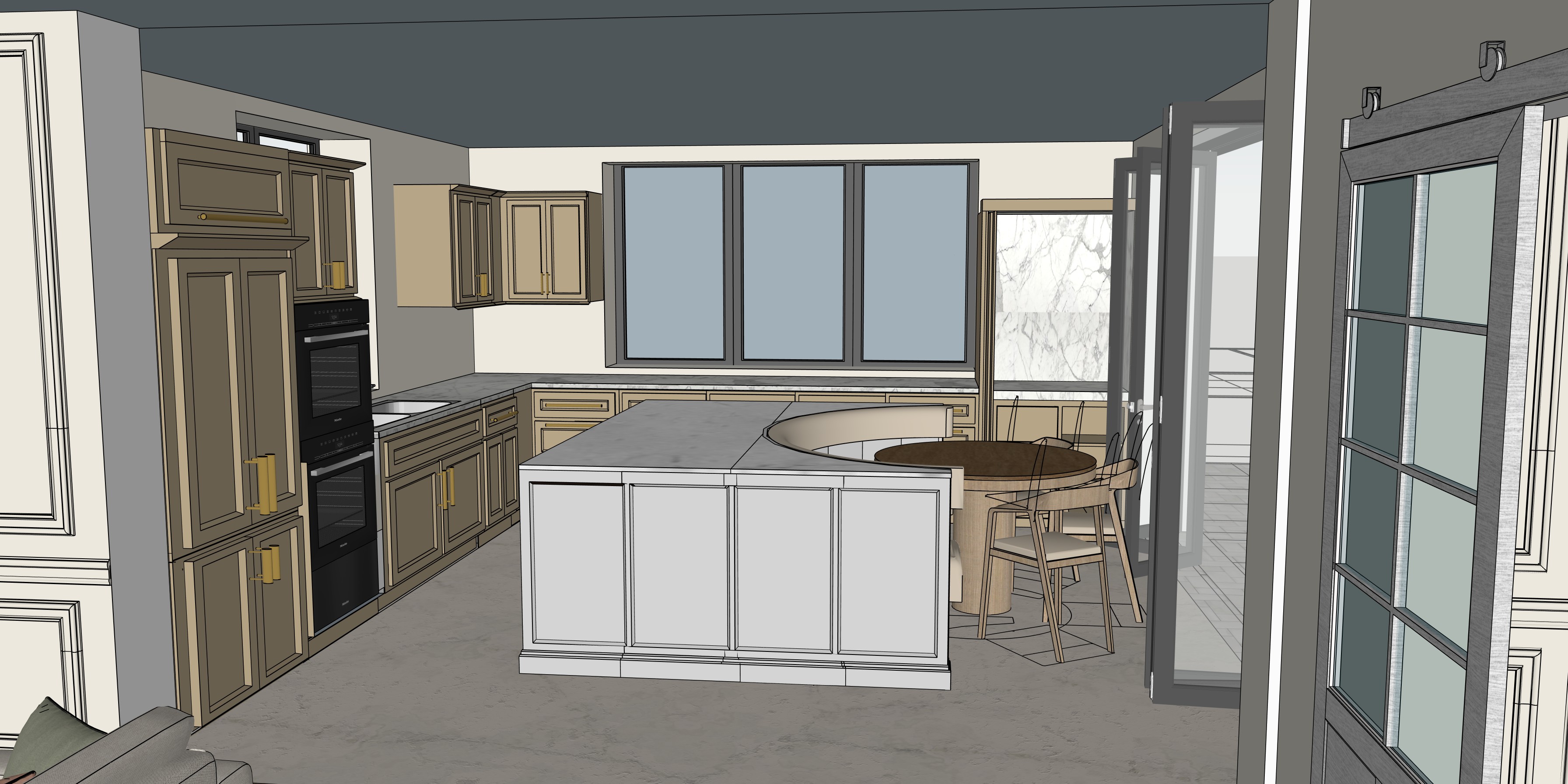 add cooker hob to island and remove from the perimeter worktop remove single coffered ceiling keep recessed spot lights add callacatta marble to worktops add pantry style shelves to tall unit to right hand side of image remove cooker hood needed remove wood grain effect to doors and island