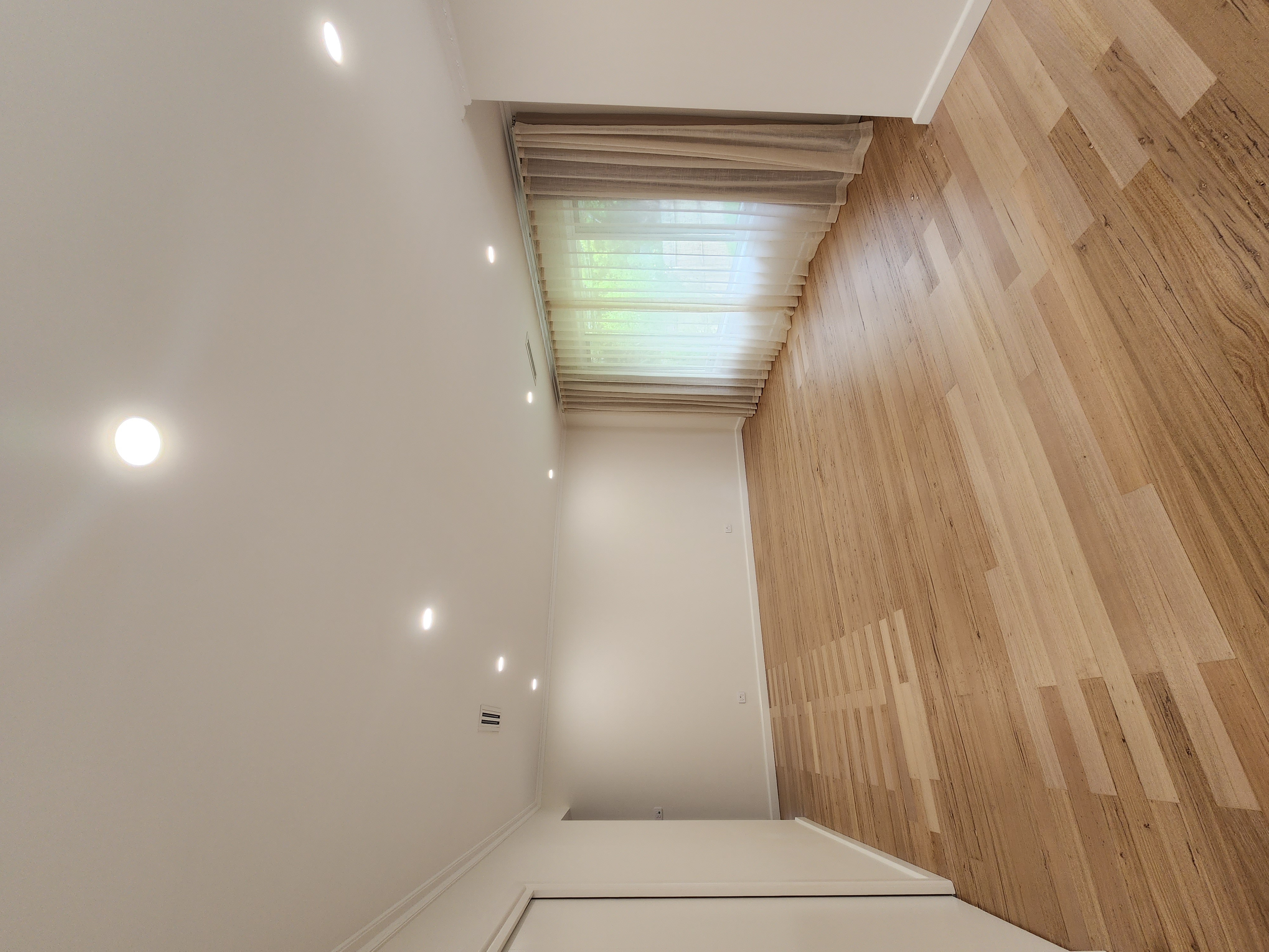 modernist interior shot interior design photograph of a mid century modern living room same blond hardwood floor white walls recessed ceiling lights floor to ceiling sheer drapes walnut credenza low teak coffee table eames style lounge chair in tan leather arc floor lamp with brass stem abstract art canvas on wall terracotta ceramic planter with snake plant warm golden hour lighting architectural digest style architecture