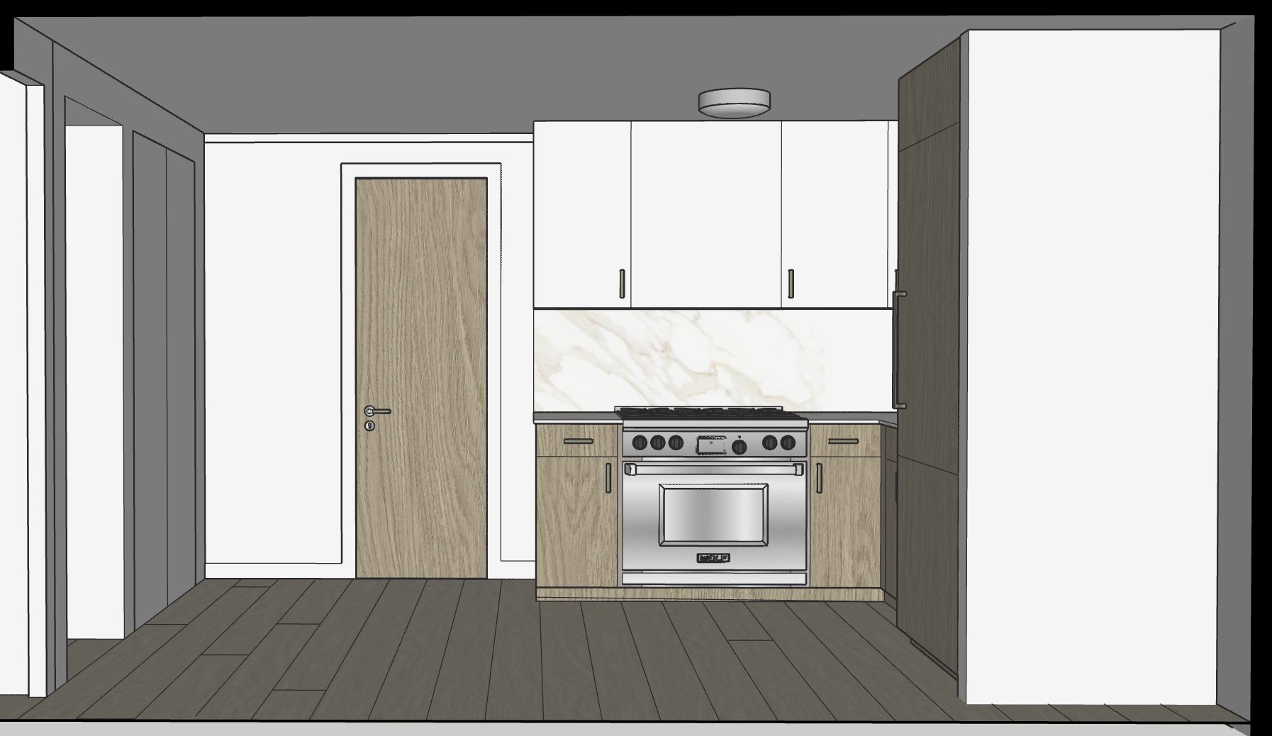 scandinavian modern kitchen interior with a cozy atmosphere use soft white for the walls and upper cabinets apply a light oak wood texture for the lower cabinets and door the backsplash should have a white and beige marble pattern the stove is sleek stainless steel dark grey flooring and ceiling for contrast soft ambient lighting from a ceiling fixture use natural sunlight to create warm inviting reflections