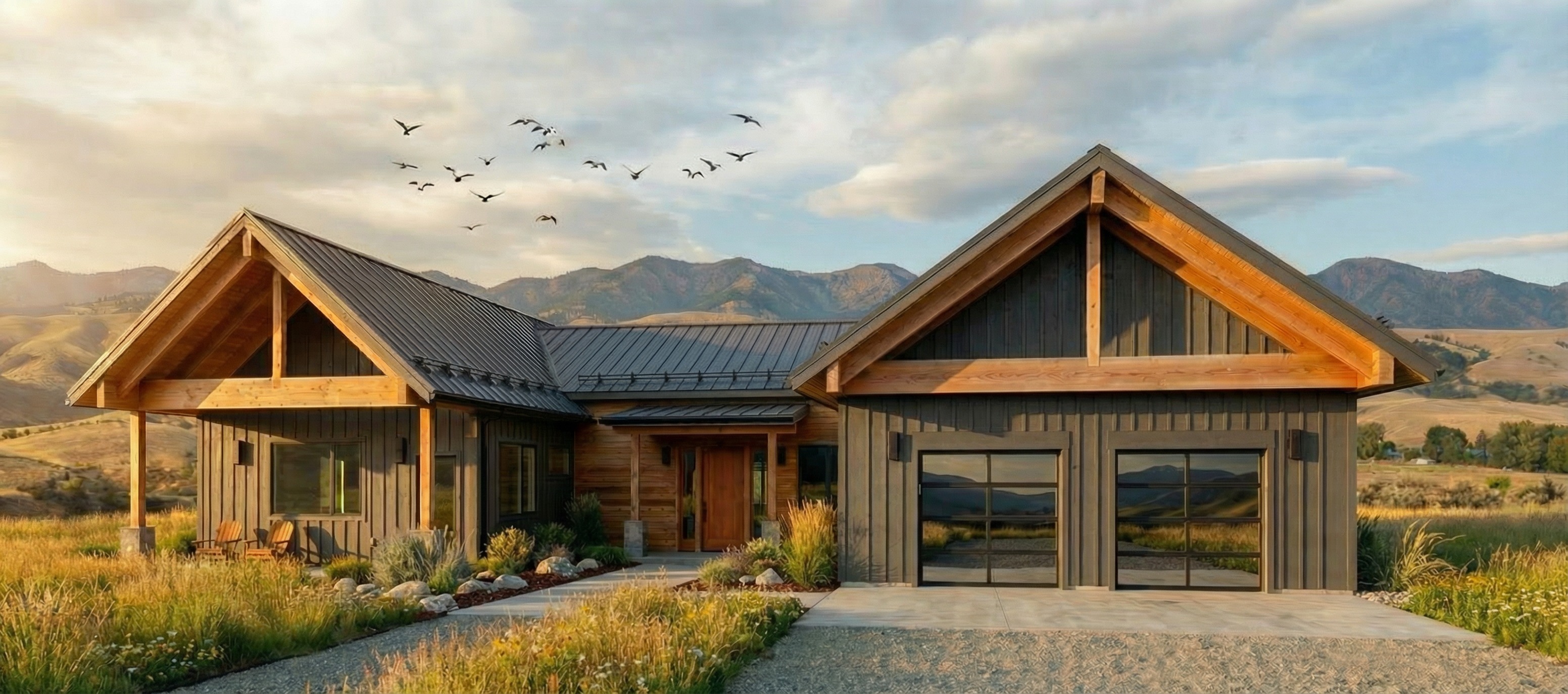 everyhting in the image stays the same except the wood posts only are dark metal i beams and the garage doors are dark metal