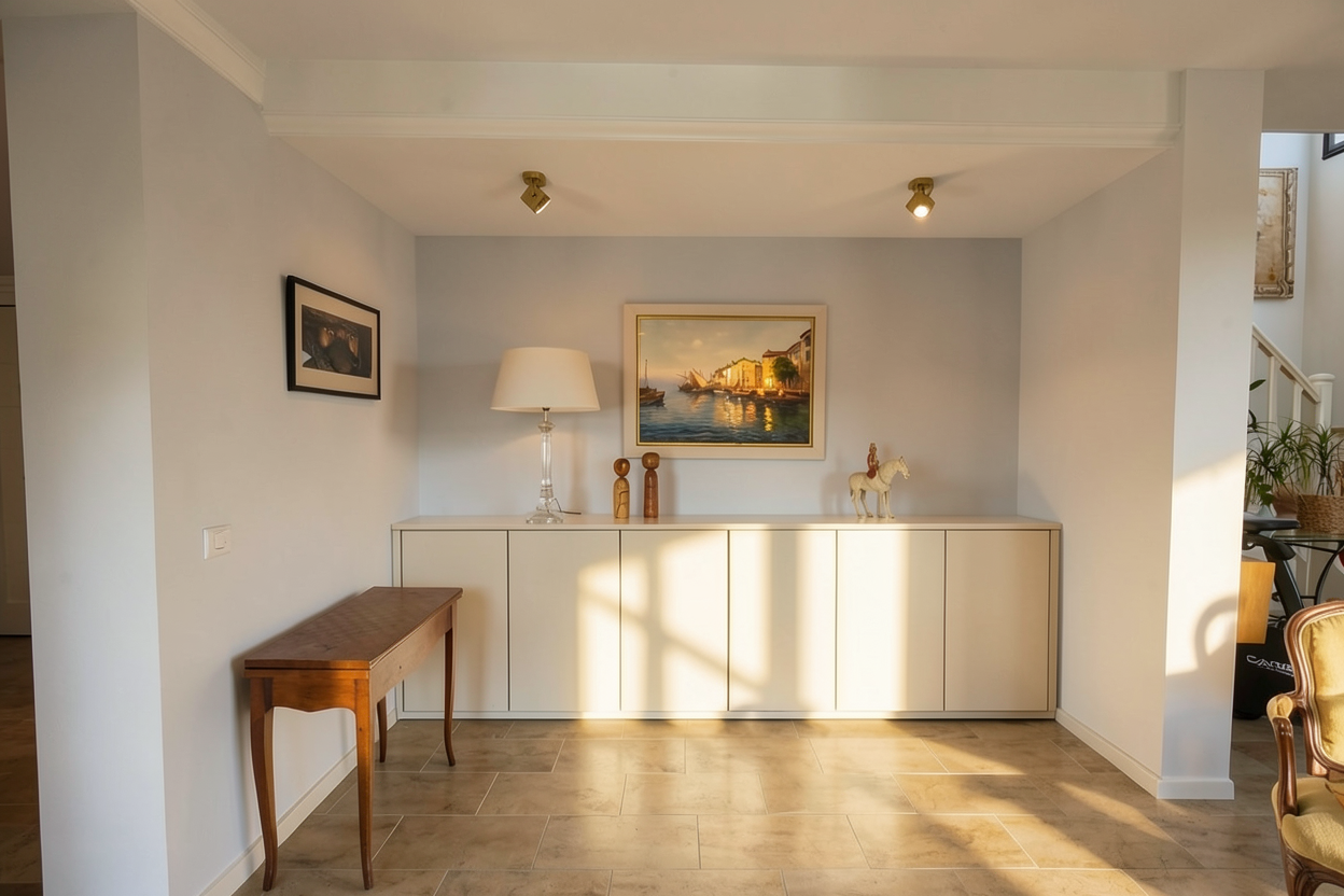 this is a cardiology office and i recommend making a high quality render the ambient light should not be warm but more illuminated with natural light and 4000k light the textures should look real and of high quality put some minimal decor on the white shelves all the writing on the wall is with led light and should be clearly visible put led lights and real greenery on the arch the logo on the greenery is with led light and should be clearly visible do not change anything in the design or organization nor add anything other than what i mentioned on the right side the text that is written ergometri and an arrow from the door and should be clearly visible and behind the white shelves also a burgundy panel