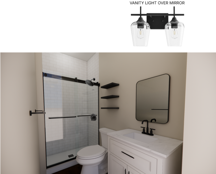 keep everything the same same layout materials and scale just add the shower head and shower control in the shower that i have shown nothing else add the vanity light over the mirror and make it look realistic make it look photo relistic