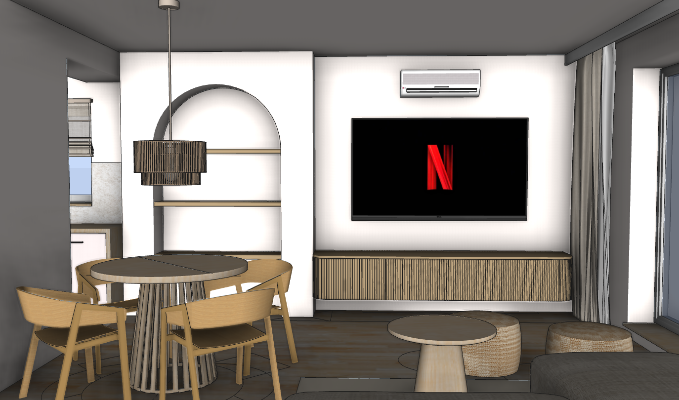 render a modern living and dining area with a cozy and inviting atmosphere the room features large windows with sheer cream curtains that allow soft natural light to illuminate the space the walls are painted in a white colours colour softly going into beige include a comfortable beige fabric sofa with minimalist design complemented by two round wicker ottomans in a light tan color the round side table and dining table are made of light wood paired with matching wooden chairs a stylish pendant light hangs above the dining area with a beige design made from fabric add a modern artwork with abstract leaf patterns in earthy tones of rust navy and beige on the wall finish with a light wood floor to enhance the cozy ambiance