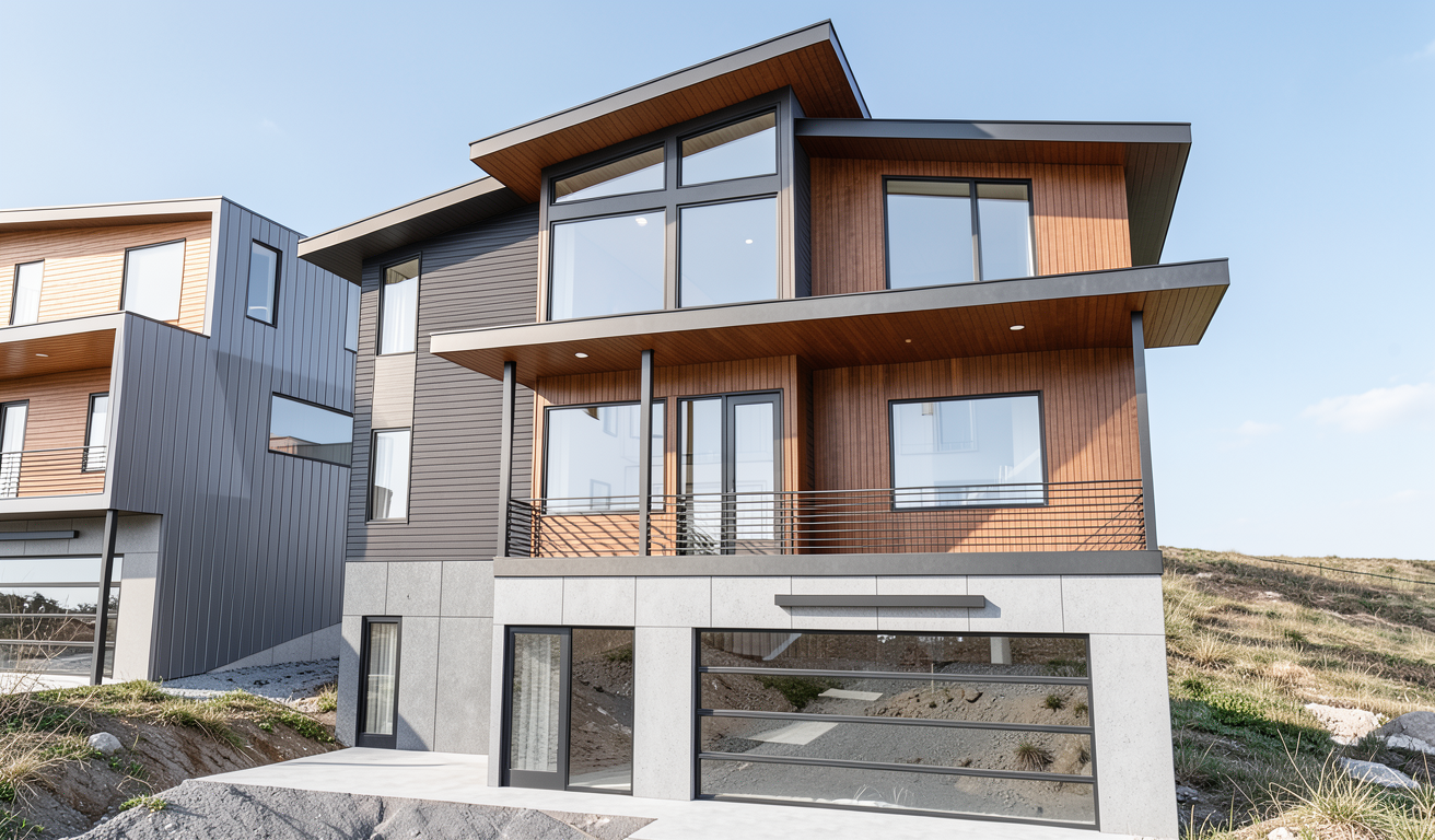 keep house shape perspective and view just as is make the photo more photo realistic showing lp nickel gap black siding add some back round really just make image photorealistic make the back entry door a lighter cedar color