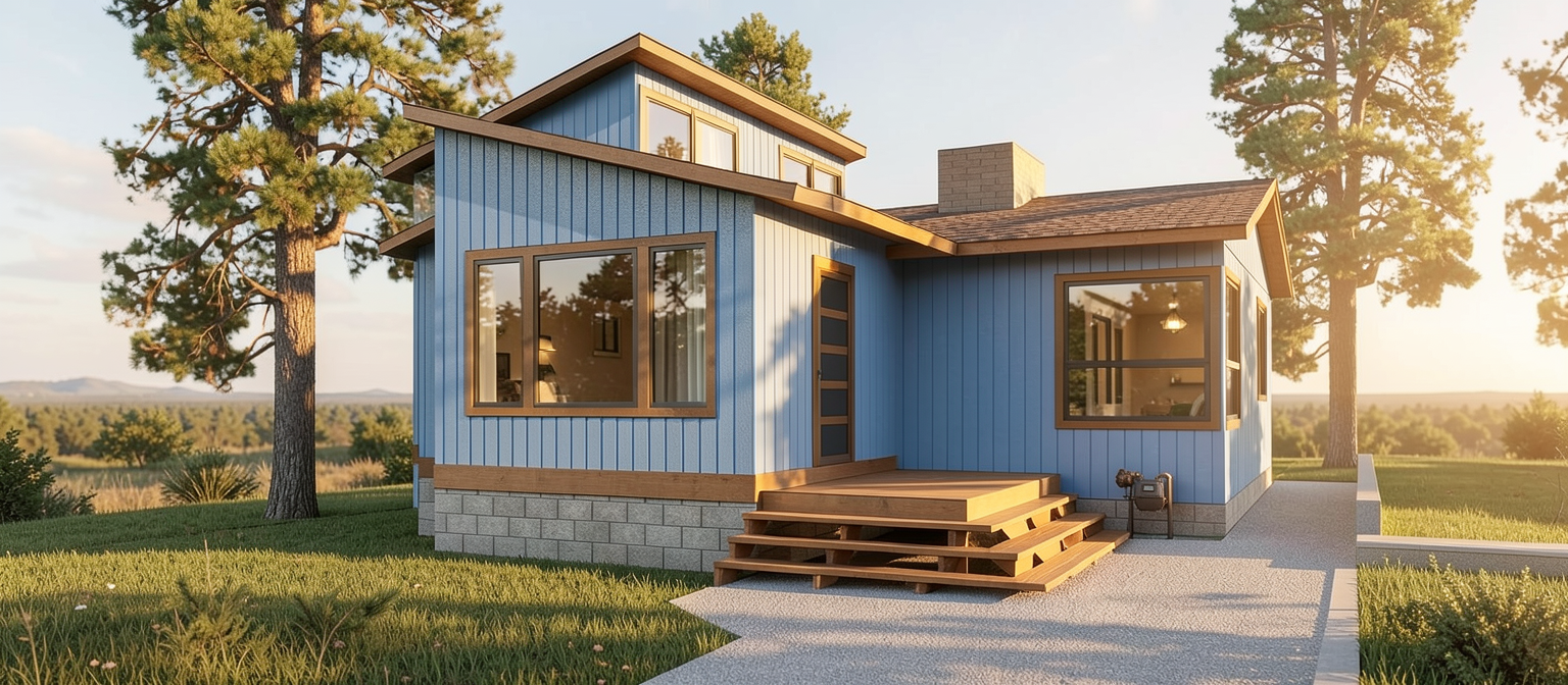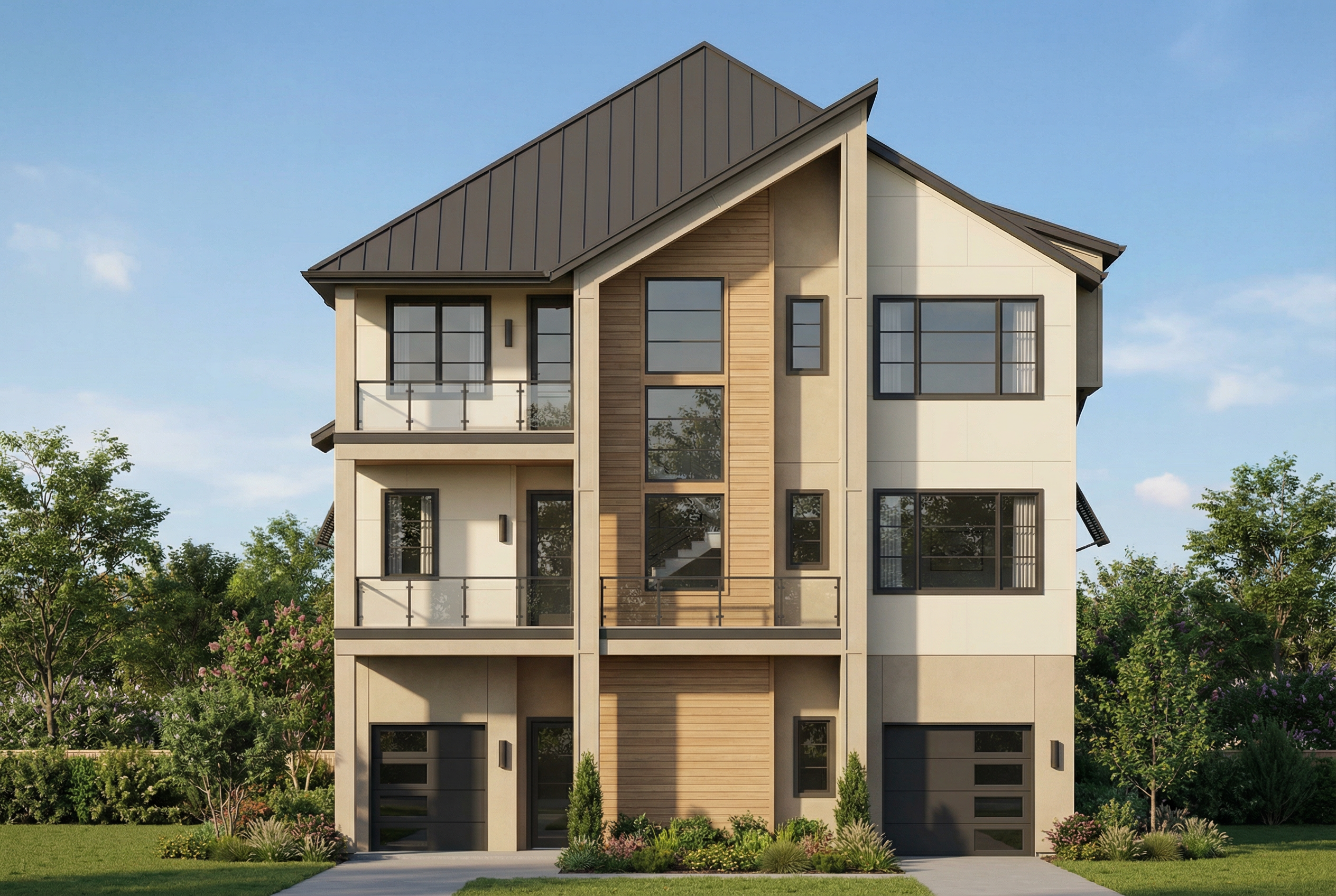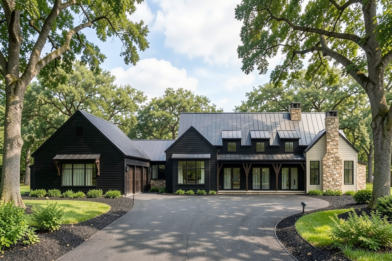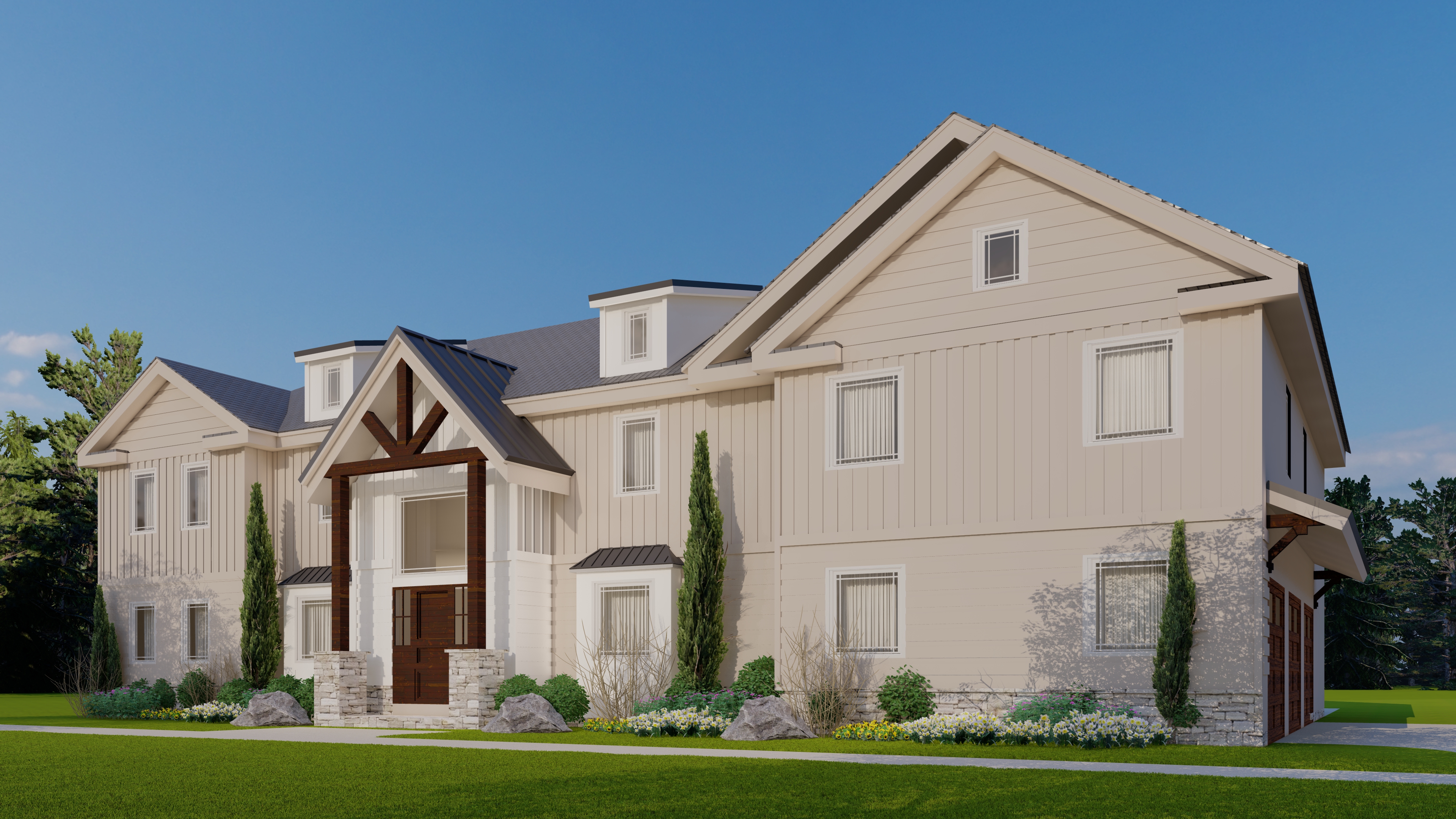 a beautiful serene modern farmhouse surrounded by lush green grass and manicured bushes the house is a two story structure with cream colored wooden siding and a dark gray roof accents of deep brown wood enhance the entrance which features a welcoming rustic wooden door stone elements are incorporated at the base of the entrance the sky is a vibrant blue with soft fluffy white clouds scattered throughout creating a peaceful and sunny atmosphere tall slender green trees dot the background adding to the natural setting
