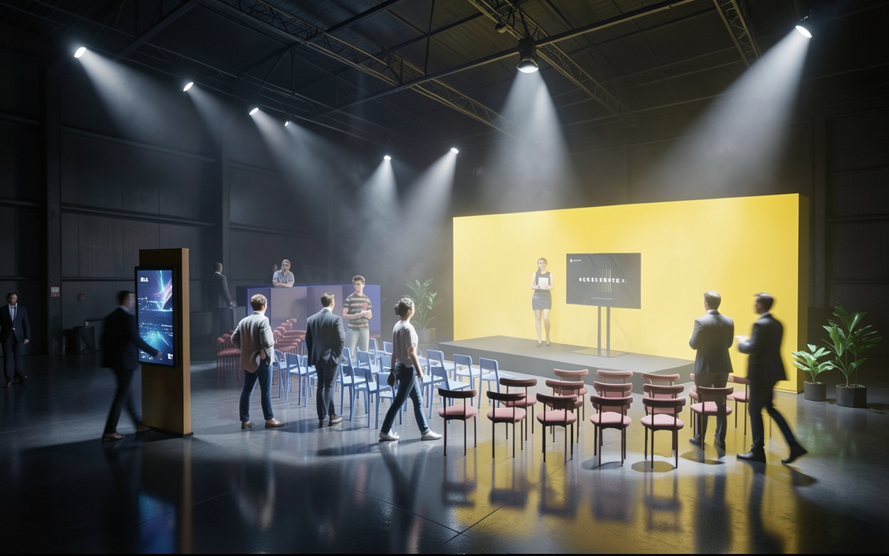 futuristic immersive exhibition space dark ambient environment dramatic cinematic lighting large open industrial hall with black ceiling strong directional spotlights with visible light beams soft atmospheric haze high contrast lighting focal stage sleek modern presentation stage with bright yellow wall and led screen minimal premium design glossy but subdued floor reflections modular exhibit kiosks with integrated screens business attendees interacting naturally slight motion blur on walking people volumetric lighting high end experiential design ultra realistic octane render unreal engine style cinematic composition depth and contrast premium brand experience