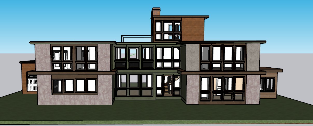 render a photorealistic 3d perspective of this house use the current material style just enhance vertical wood siding concrete walls keep model geometry the same windows doors roof walls garage door pavement driveway do not change the view only enhance the current materials
