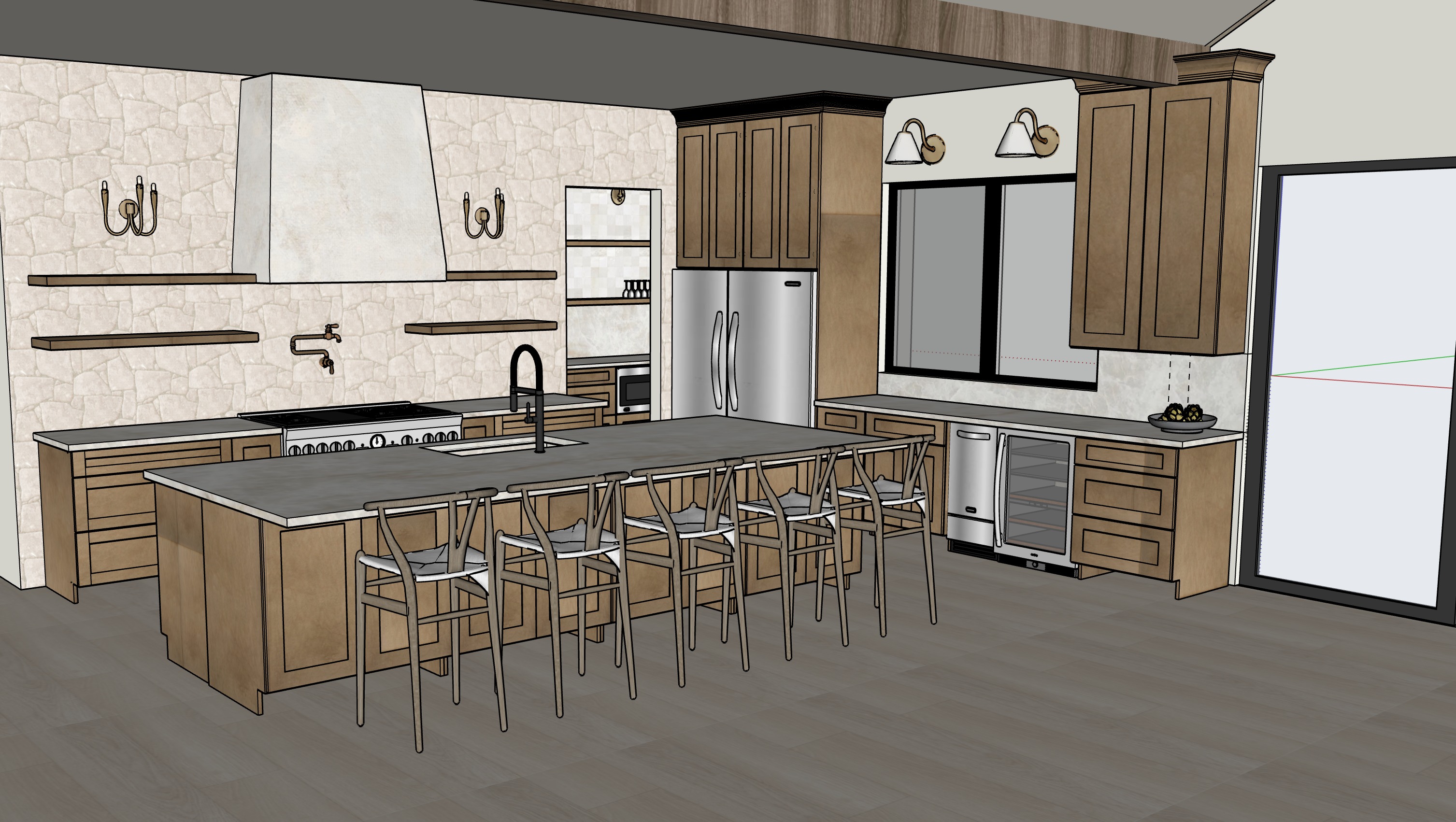 add more natural light streaming in the window lighten the wood on the cabinetry to a white oak make the stone backsplash more believable white rough stone the countertops should be taj mahal quartzite a warm white stone with subtle brown veining