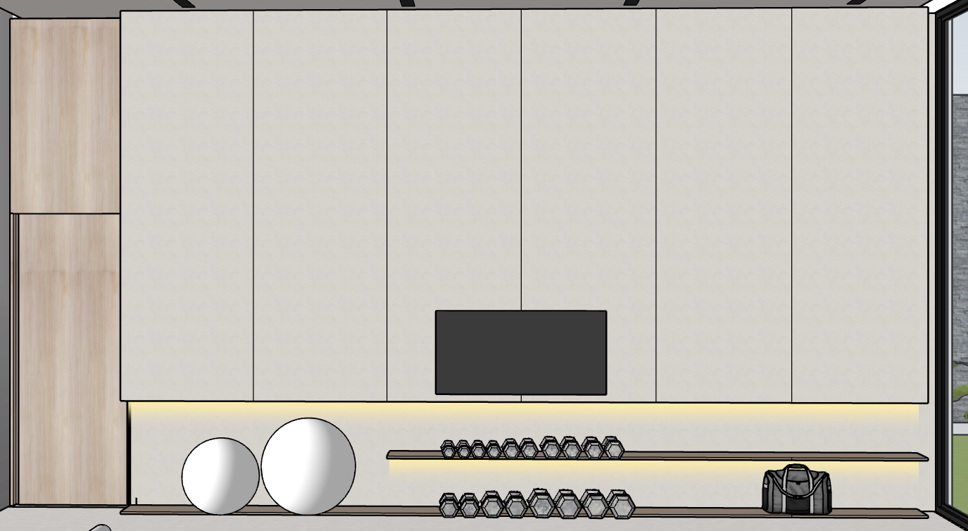 render a modern minimalist gym room with warm natural lighting the walls are a sleek cool gray while the ceiling is a slightly darker gray with black strip lighting use light wood for the vertical panels on the left wall the back wall features large off white storage cabinets with a glowing led strip beneath place two white exercise balls and silver dumbbells on a light gray floor the right wall is made of large floor to ceiling glass panels opening to a lush garden with vibrant green plants and a textured gray wall the atmosphere is serene and inviting with an emphasis on clean lines and neutral tones
