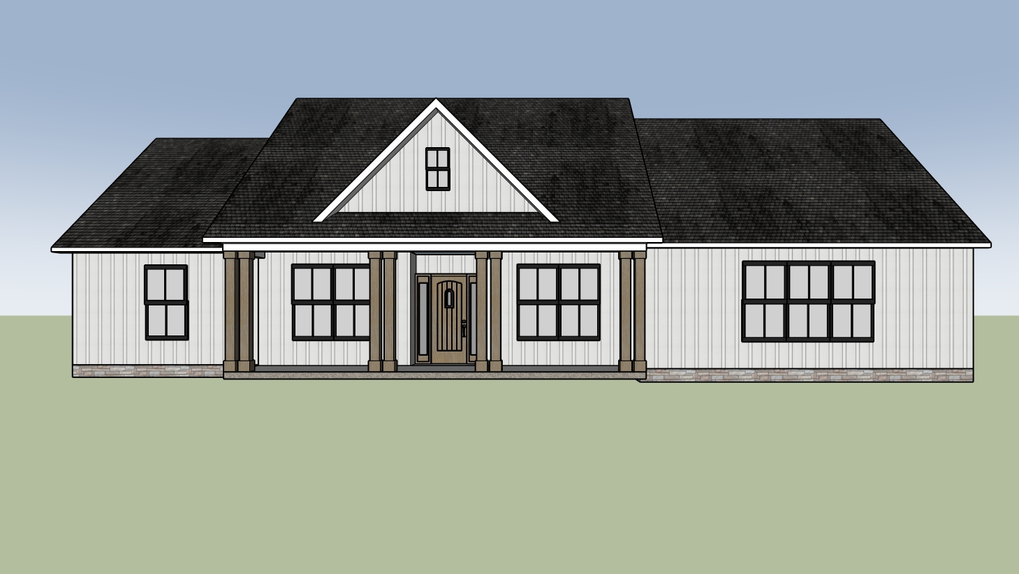 a manicured lawn layered flower beds low maintenance shrubs native plants concrete sidewalk from right side garage to front door driveway enters on right side show mature in the background with the appalachian mountains show clouds in the sky