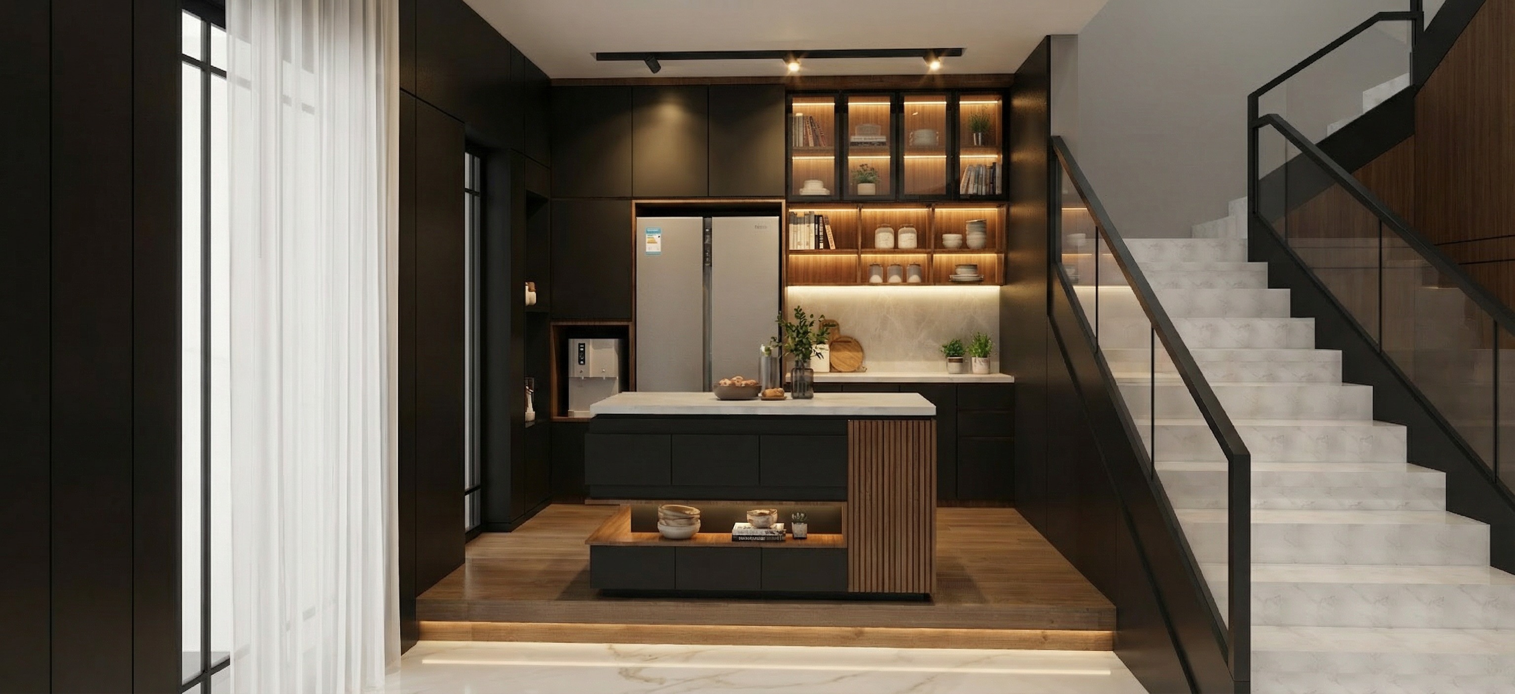 make the black color a little bit lighter add bronze mirror to the open shelves there change the island shelve decor become books and small vase