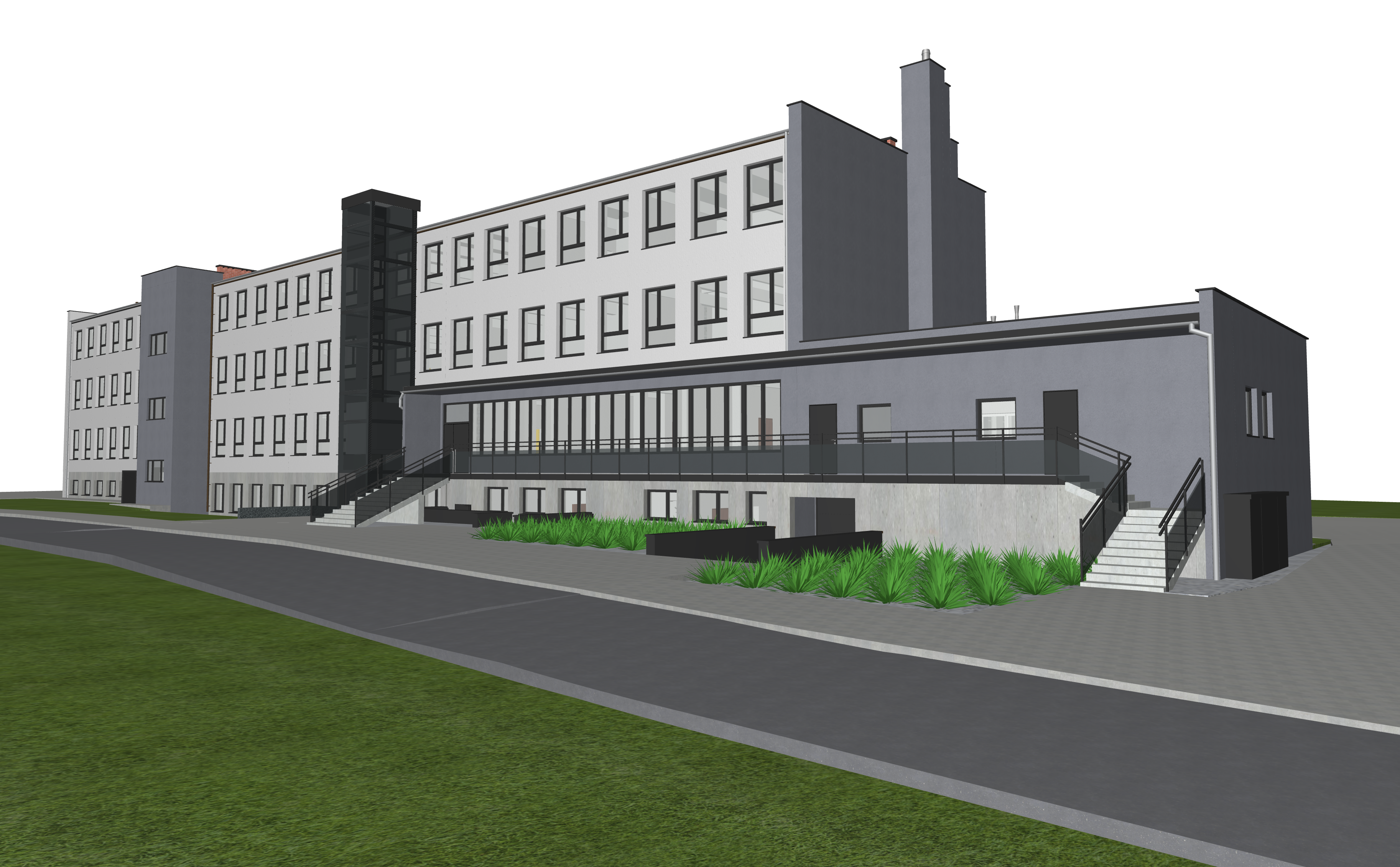 school building many school children street and sidewalk in front white and graphite plaster with lines sunny day do not change the building