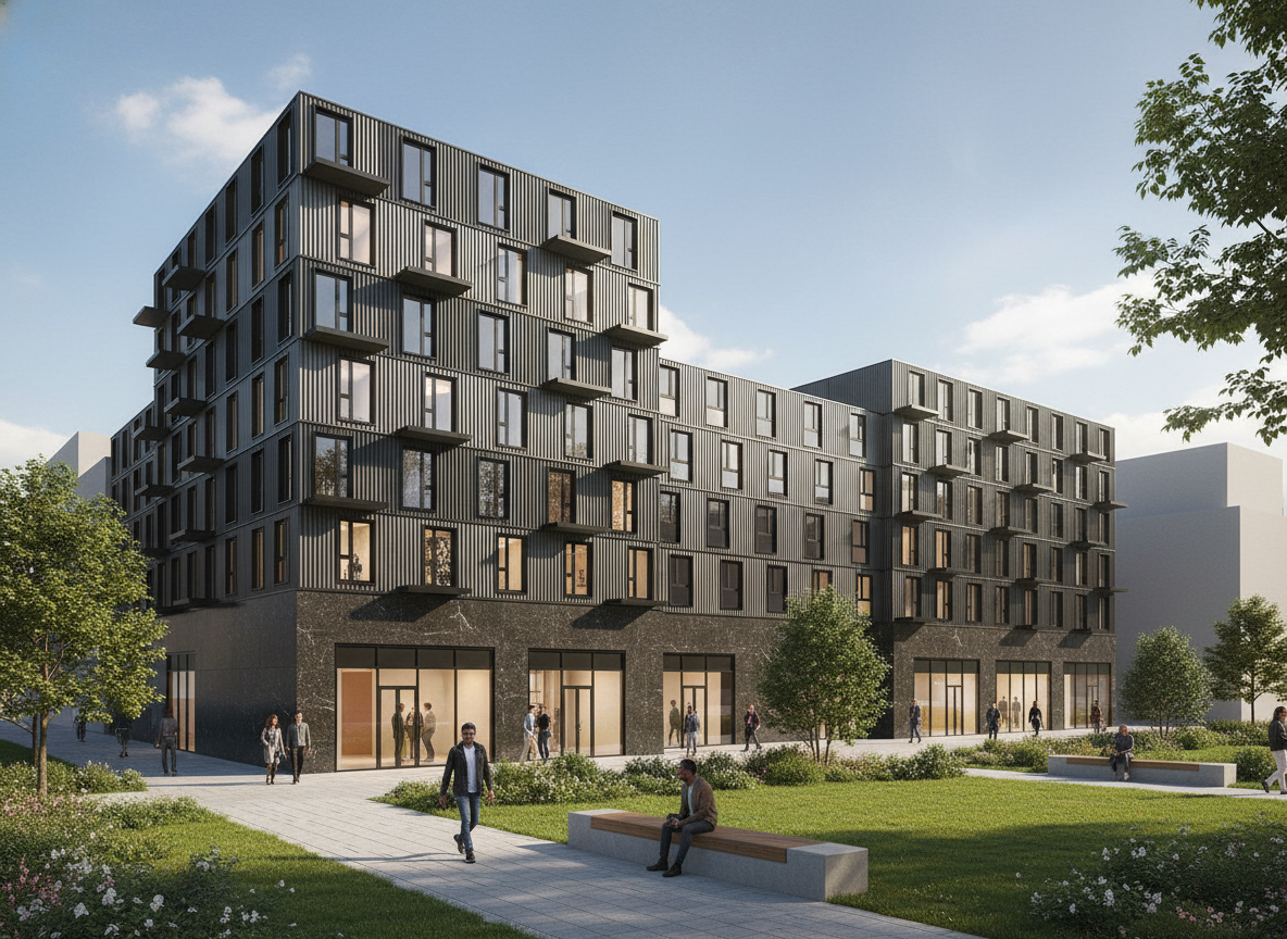 black granite plint to 4 5m large openings 3 5m high for commercial space four different red tints of corrugated steel to upper facade pixelate pattern by changing direction of corrugated steel change direction of corrugated steel per volume black windows light emitting add people inside and out 2 lane road in foreground red balconies with steel strip balustrade large multistep birch trees people and cyclists