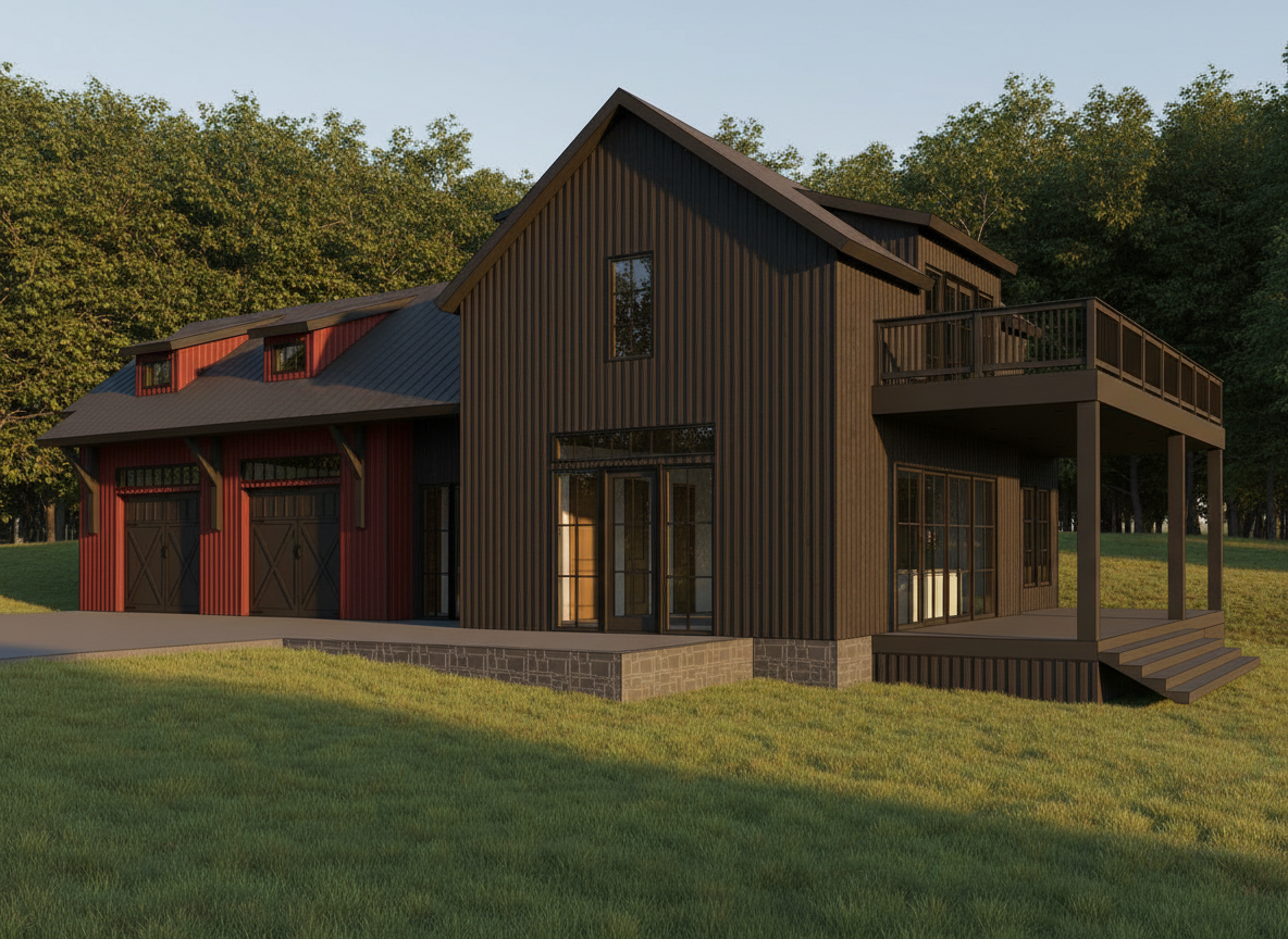 do not change the building shape or details use red vertical wood strip siding for the red shaded walls and utilize dark brown vertical wood strip siding for the right half of the building place the building near a tree line in a short grass field that is gently sloping down left to right make all the interior walls and doors an alabaster color and add comfortable wood and leather furnishings inside the building add comfortable and contemporary outdoor furnishings on the porch below the raised deck darken the interior and add smoke tint to the glazing add soft blue sky with minimal clouds and diffuse natural light