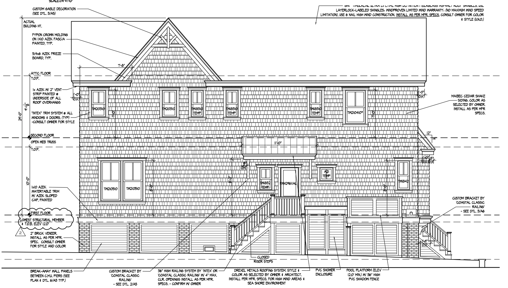 dark grey roof natural cedar siding white trim azek slats on openings of foundation lighr red brick foundation