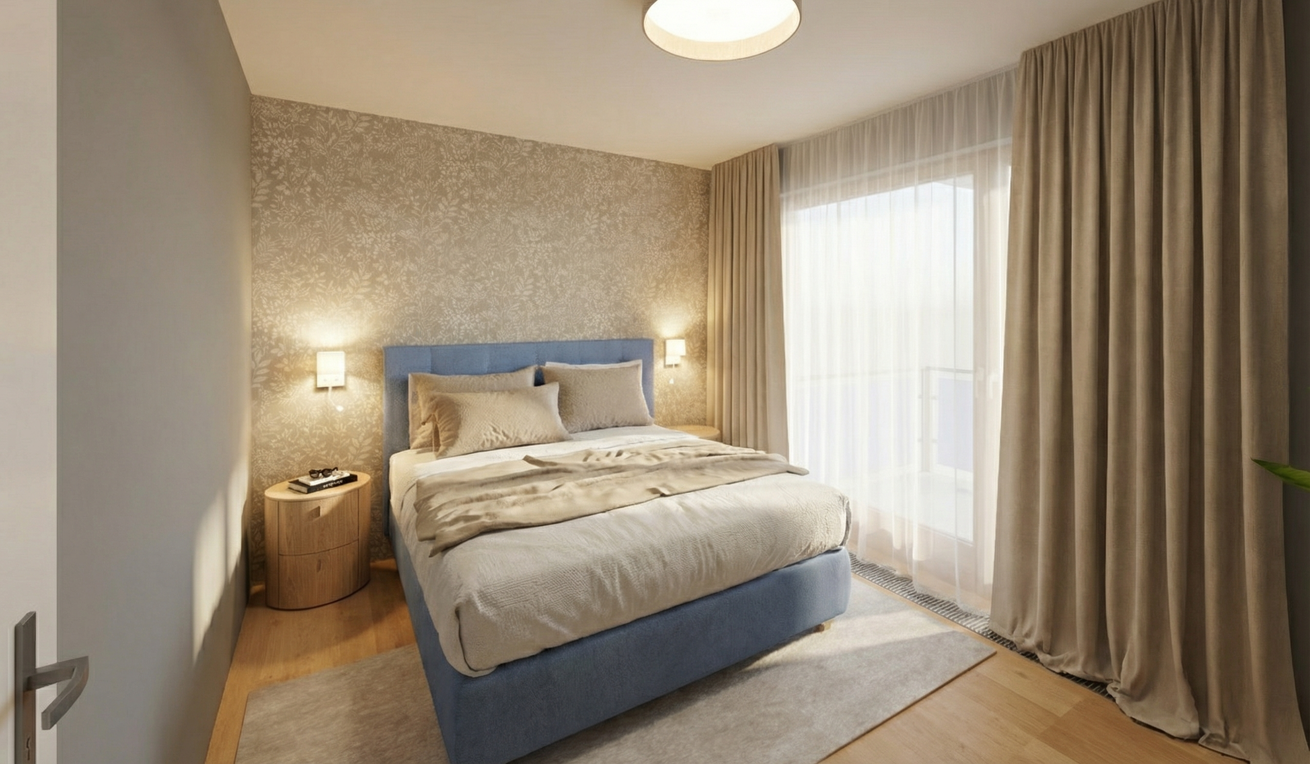 you are given an existing black and white architectural floor plan image absolute rules do not violate do not change the layout in any way do not move resize add or remove walls doors windows stairs or rooms do not alter dimensions scale or proportions do not move resize add or remove any furniture treat the plan as architecturally locked and construction accurate any geometric change is a failure your task keep the floor plan exactly the same only enhance the visual appearance using color materials and subtle styling flooring light natural oak wood flooring in all living areas bedrooms kitchen dining halls and closets light gray tile in all bathrooms smooth gray concrete in garage front porch flat matte finish only no patterns no gloss no dramatic contrast furniture keep all furniture exactly where it is do not change furniture shapes sizes or locations apply a west elm crate barrel aesthetic for aestetics and furniture central texas vibe kitchen baths show only the following appliances sink range refrigerator do not show a dishwasher no icon no placeholder no suggestion of location kitchen and bathroom countertops white or off white quartz subtle marble style veining clean premium understated text labels remove all text room names labels dimensions arrows notes symbols style output top down flat architectural view only no perspective no elevations no 3d effects clean consistent line weights very subtle depth only no shadows that imply height pure white background high end residential marketing quality calm polished brochure ready final check mandatory the finished plan must be dimensionally identical to the original only materials finishes and color should change furniture should look more realstic