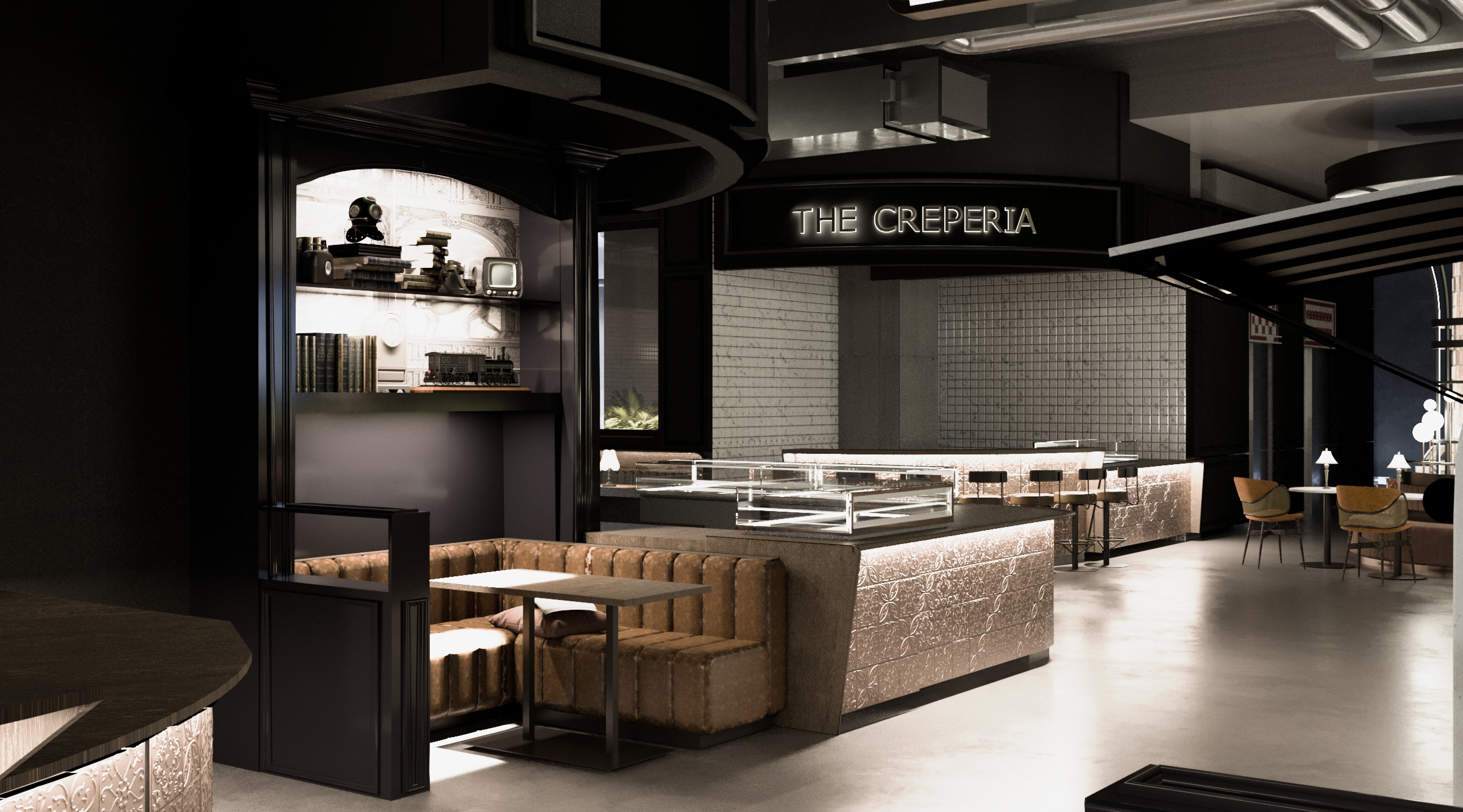 the shop is a tobacco stall with a word logo on top and the island is a coffe stand