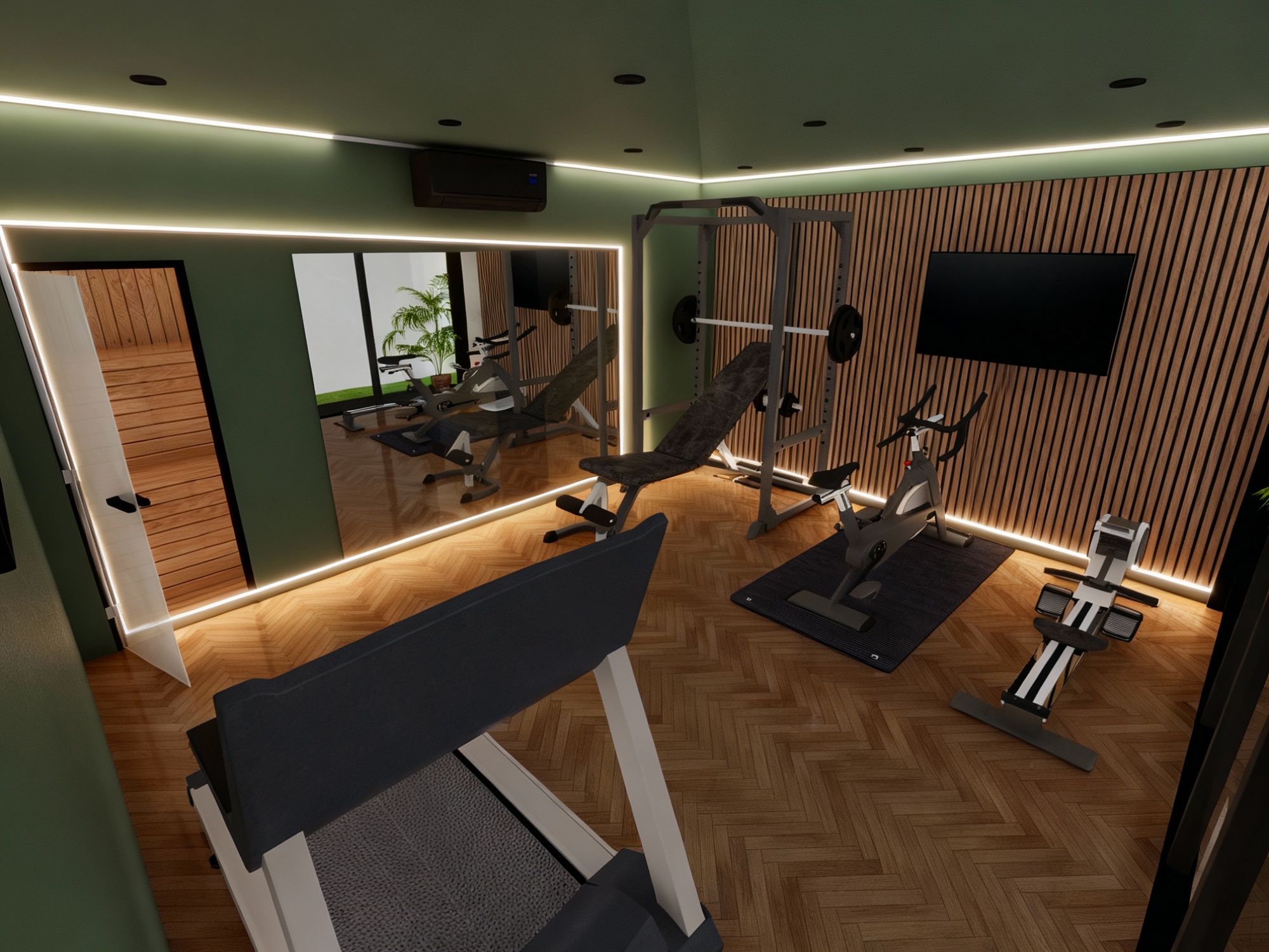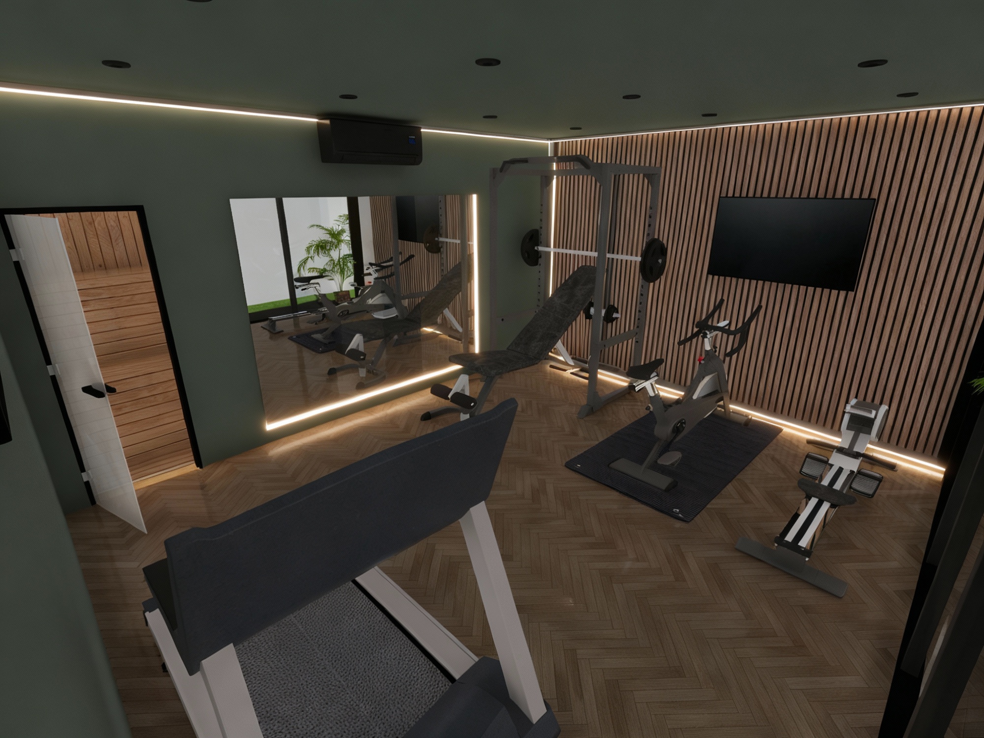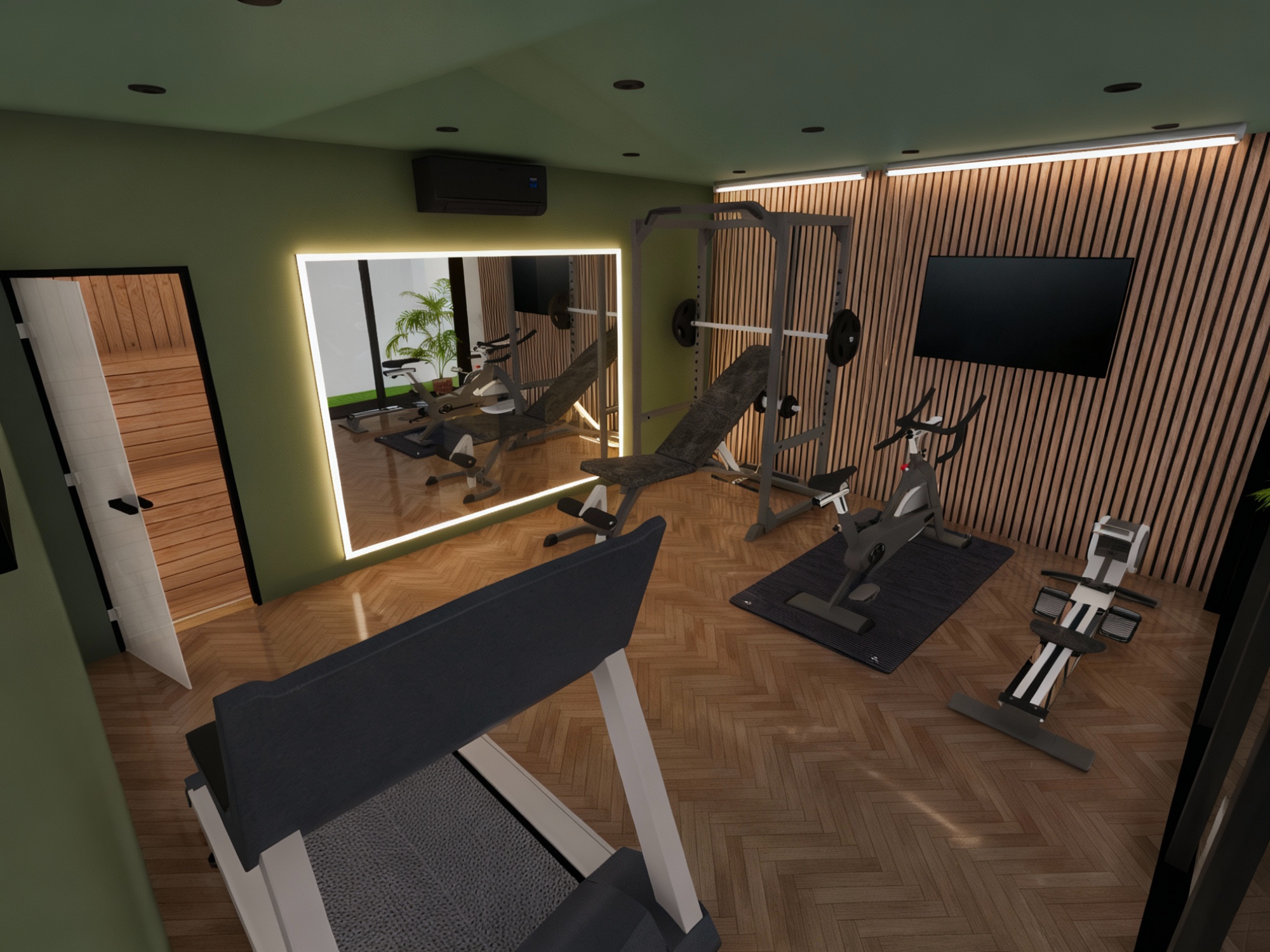 paint all walls and the ceiling in ral 6009 fir green the ceiling is smooth not slatted higher at the front and slopes gently toward the back the mirror must be surrounded on all four sides by continuous warm white led light emission forming a soft diffused halo the aluminium led profile is fully recessed and hidden so only the glow is visible not the profile the slatted feature wall is the only slatted element in the room and consists of thin narrow vertical timber slats only the top of the slatted wall runs perfectly level creating a visible painted gap above it in ral 6009 measuring approximately 30 mm at the rear and increasing to a maximum of 100 mm at the front due to the ceiling slope with no timber in this gap a second painted gap of 100 mm is maintained below the slatted wall above the floor soft warm white led light emission is installed directly above and directly below the slatted wall to gently wash the slats with all led profiles hidden in built in recesses and no lighting mounted on the floor no slatted or timber ceiling no visible aluminium profiles and no additional slatted surfaces are to be generated