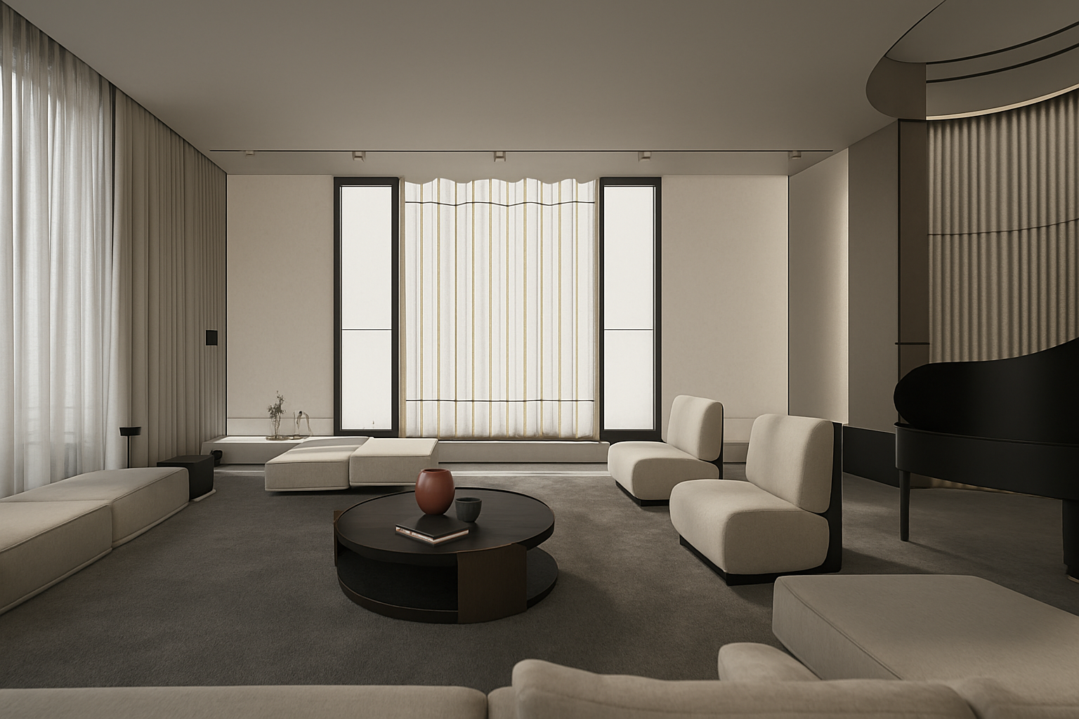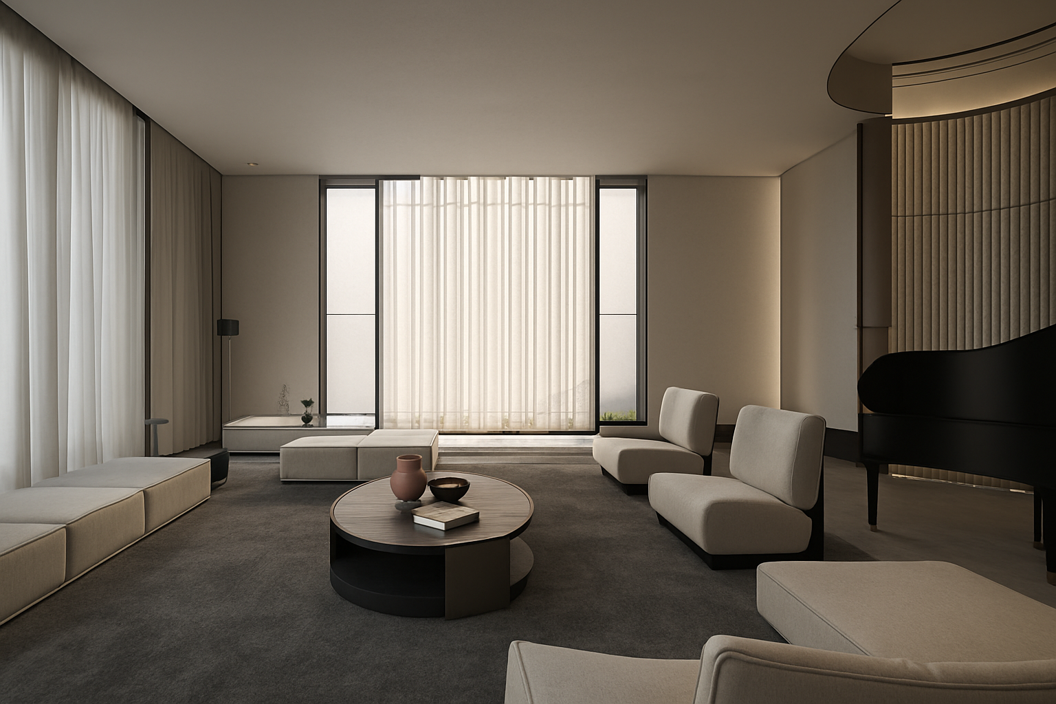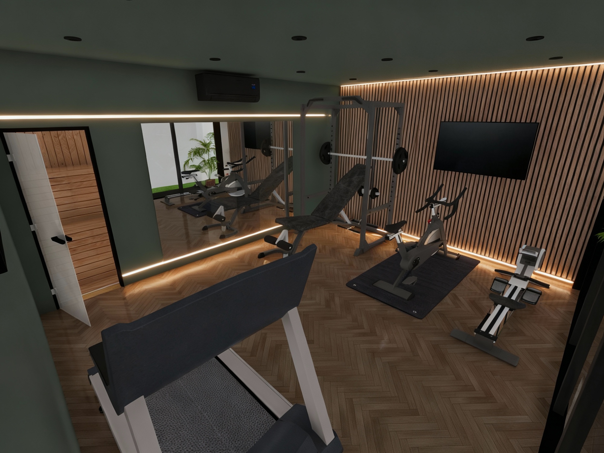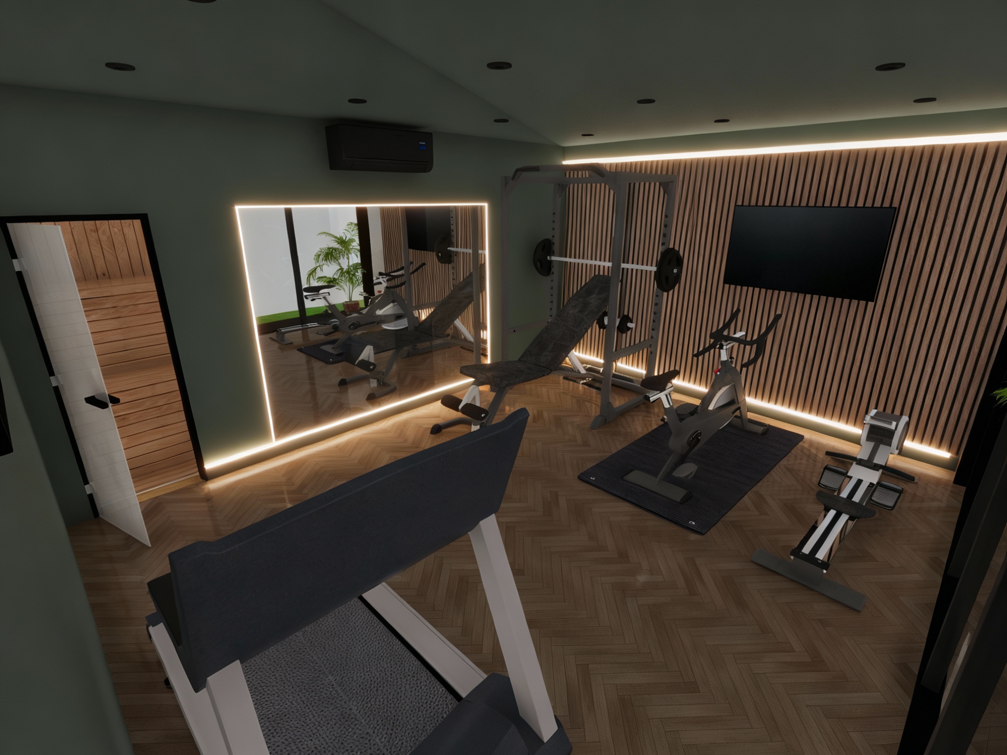 paint all walls and the ceiling in ral 6009 fir green the ceiling is smooth not slatted higher at the front and slopes gently toward the back the mirror must be surrounded on all four sides by continuous warm white led light emission forming a soft diffused halo the aluminium led profile is fully recessed and hidden so only the glow is visible not the profile the slatted feature wall is the only slatted element in the room and consists of thin narrow vertical timber slats only the top of the slatted wall runs perfectly level creating a visible painted gap above it in ral 6009 measuring approximately 30 mm at the rear and increasing to a maximum of 100 mm at the front due to the ceiling slope with no timber in this gap a second painted gap of 100 mm is maintained below the slatted wall above the floor soft warm white led light emission is installed directly above and directly below the slatted wall to gently wash the slats with all led profiles hidden in built in recesses and no lighting mounted on the floor no slatted or timber ceiling no visible aluminium profiles and no additional slatted surfaces are to be generated