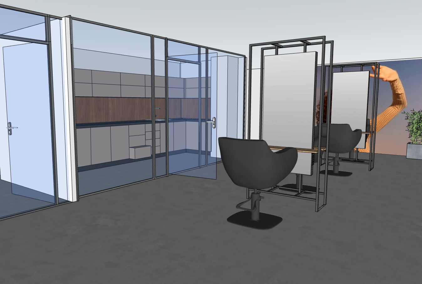 erstelle ein r ndering des bildes auf dem bild ist der ausschnitt eines friseursalons zu sehen dort stehen arbeitspl tze mit einem metallrahmen aus 25 25 millimeter stahlprofil als schwarzstruktur gepulvert der boden ist mit industriefarbe in beton optik