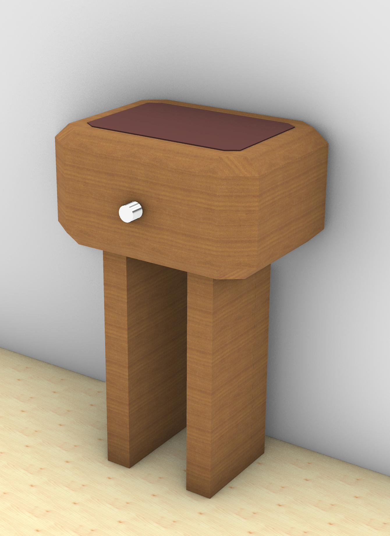 this is a table in cherry wood it has 1 drawer with a metal knob the top has a red leather inlay there is a wood floor in lighter oak the wall is white make it photo realistic crisp lighting