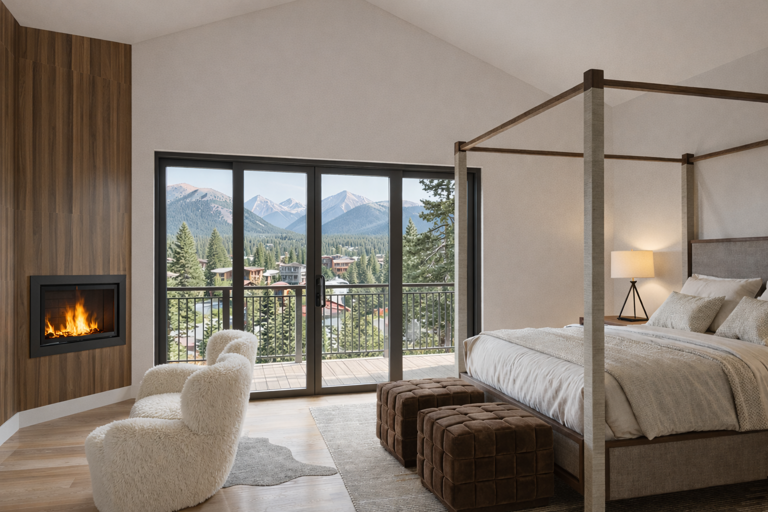 transform this incomplete interior rendering into a highly photorealistic image and shift the fireplace to be directly across from the bed flat against the wall