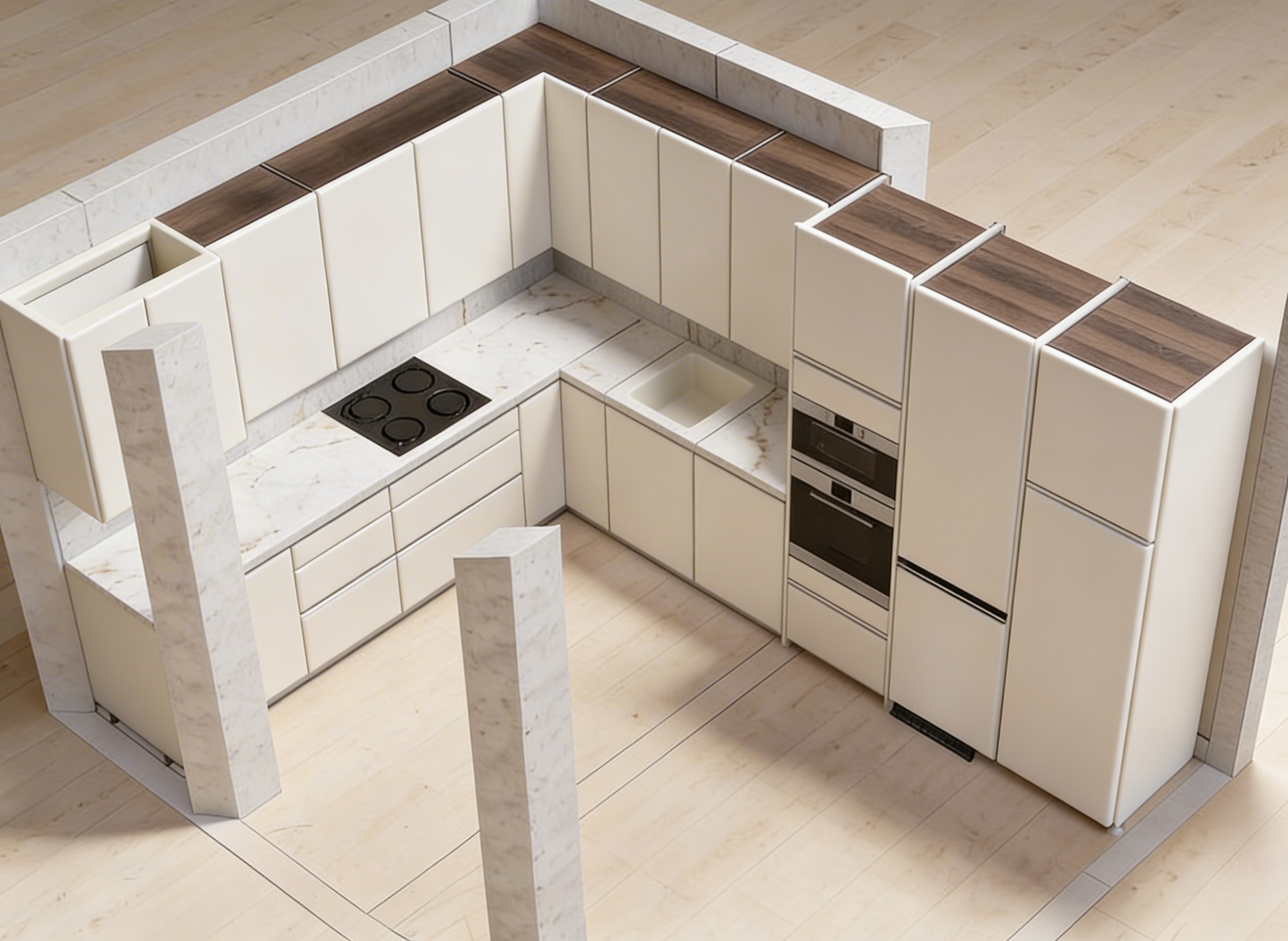 pon iluminacion en los muebles altos para iluminar la encimera pon todas las puertas lisas y del mismo color