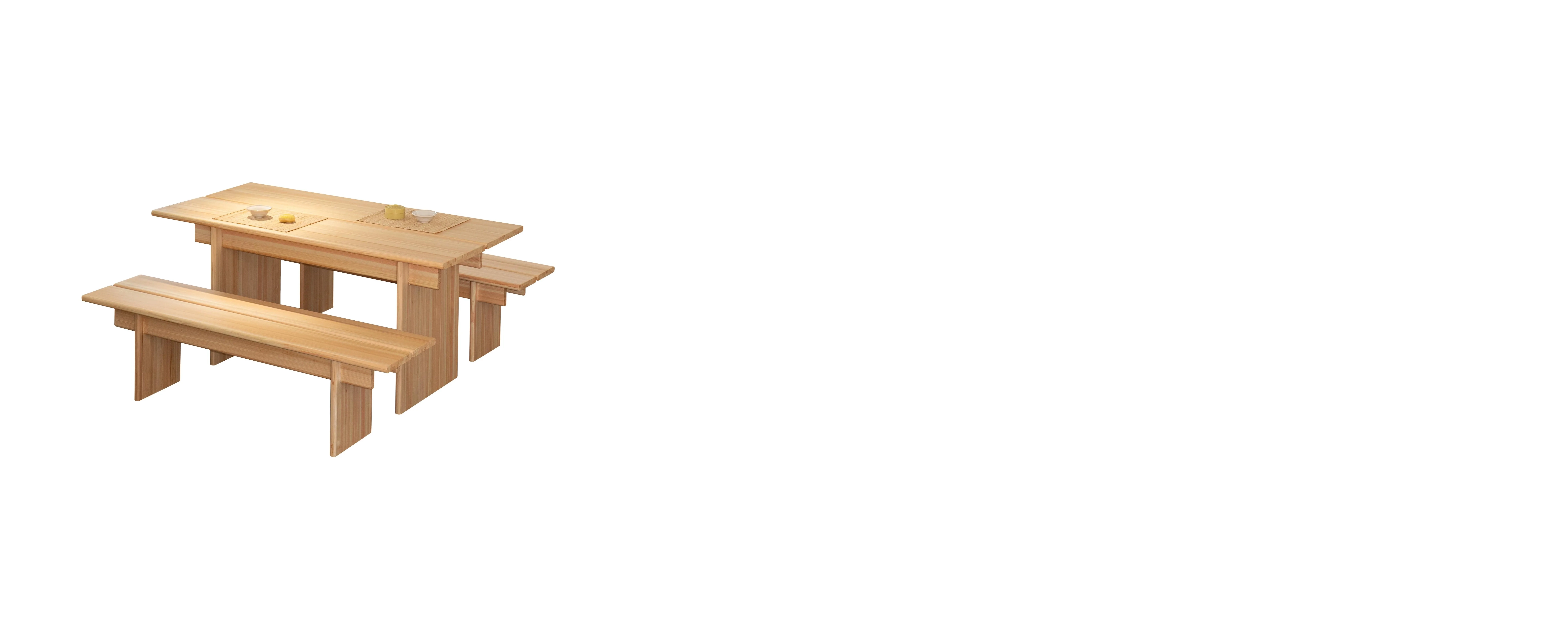 replace the current plain white background with a warm cozy modern dining area in a bright home interior use soft neutral wall tones such as warm beige with light wooden flooring to create a cozy premium home atmosphere keep the dining table set table and benches in the exact same position angle scale and perspective as the original image do not alter the furniture s design dimensions proportions structure wood grain color texture or orientation in any way add minimal tasteful dining area elements to enhance the scene without overpowering the furniture such as soft daylight entering from one side e g window light light greenery small indoor plant or potted plant placed in the background optional minimal wall decor simple framed artwork ensure consistent natural lighting with soft realistic shadows and reflections to highlight the wood texture and craftsmanship maintain a clean uncluttered composition suitable for premium furniture catalog showroom visuals or e commerce product photography