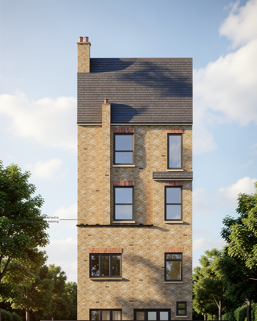 this is a house on top of small pond with small trees in the background the wall material is black burned wood posts please make it realistic and leave the landscape as it is the ground is dark brown with lush deciduous plants add darmera peltate plants under the house and around water leave the original structure i drawed the extent of the pond area in blue openings are in dark black