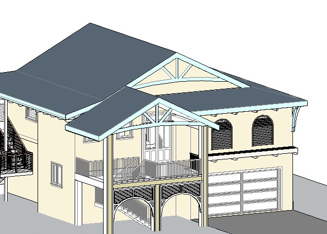 the walls are a pale yellow the trim is white the windows over the garage are depicted as louvers only the roof is light teal metal the pattern at the front porch columns is a white band on either side of the column with a band of light oolite stone in the middle