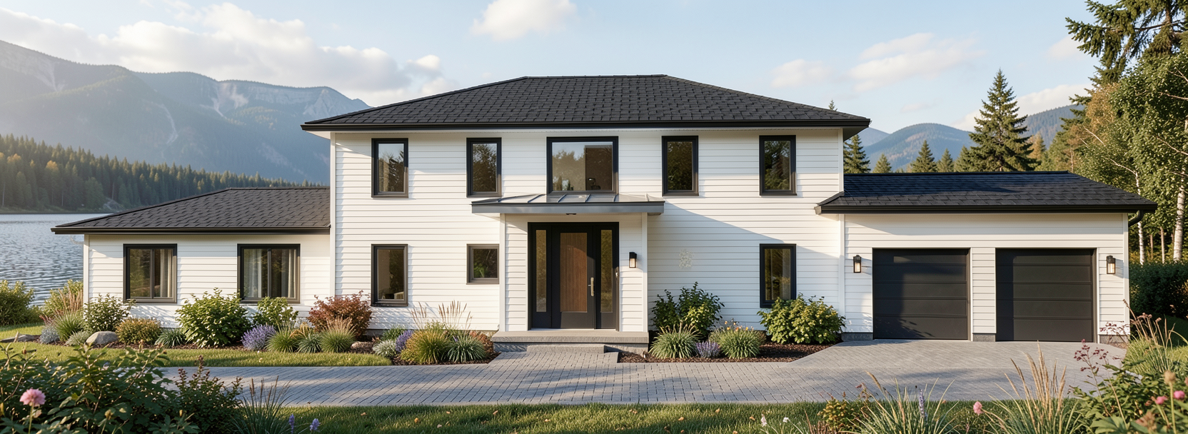generate beautiful elevations renders with furniture and light inside with white stucco on front walls top down from above with sunlight at dusk
