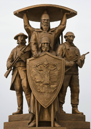 futurism exterior shot plastic statue futurism in white red and blue colors warriors from different eras of russi architecture