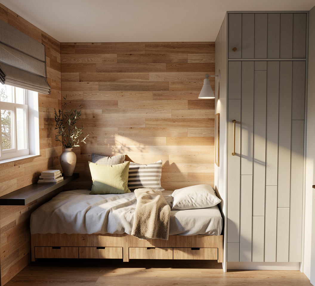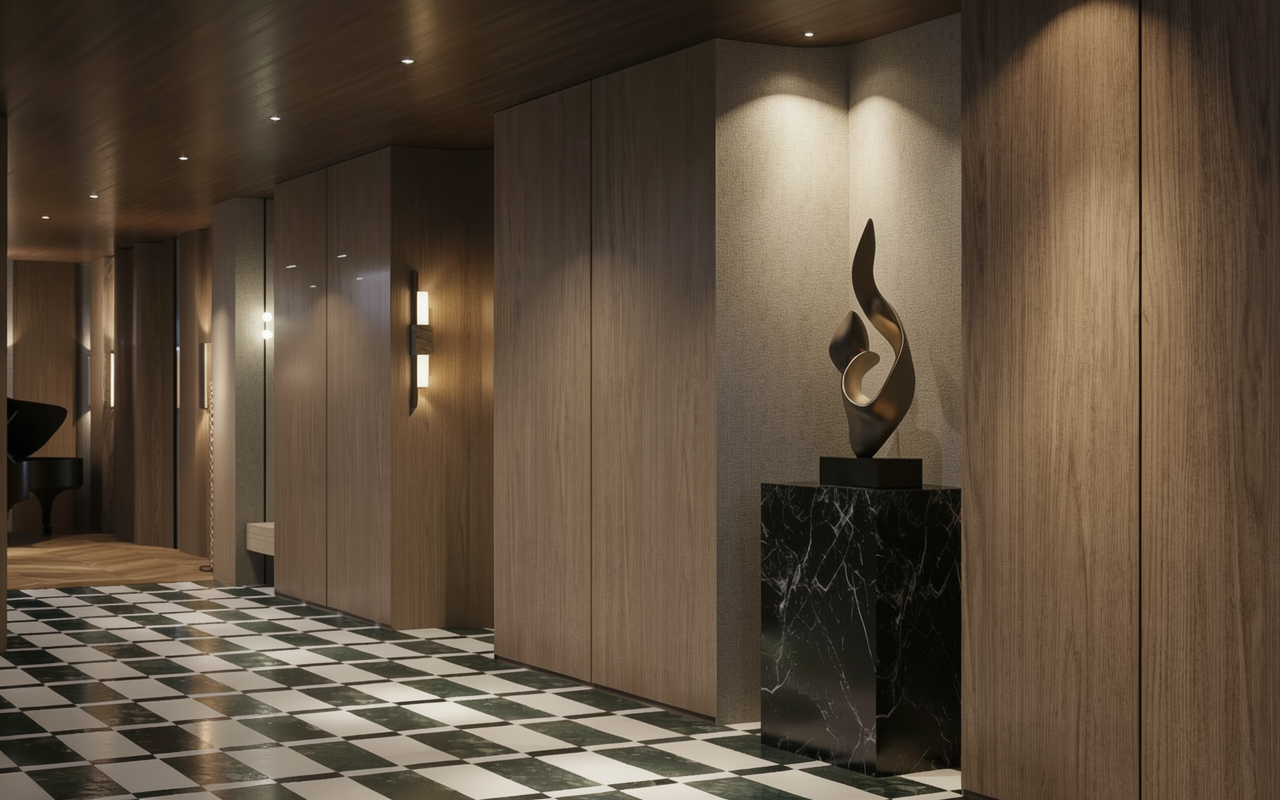 improve materials texture make it realistic keep colors tones and patterns the same make the image photorealistic high resolution keep all elements and colors the same keep image environment at night time don t make environment too dark keep same lighting keep same camera distance avoid zoom in keep same camera angle calm ambient luxury feel maintain same wooden color as reference image no glare around wall lights keep same flooring colors maintain curves on the walls same as reference image no glare aroun light bulbs make the ceiling a little darker