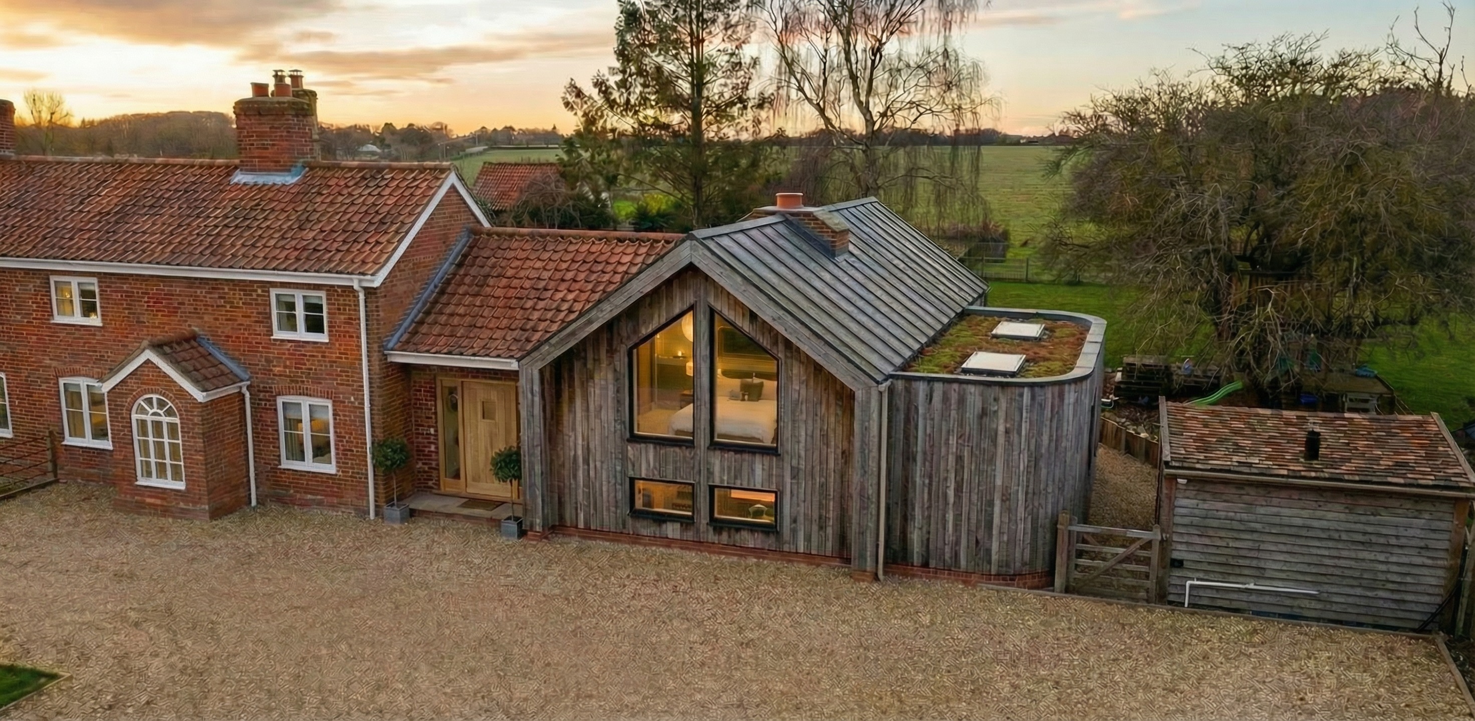 change the thin gable overhang to a steel clad material to match the current dark charcole roof leaving the central area of the gable end surrounding the windows in the vertical timber