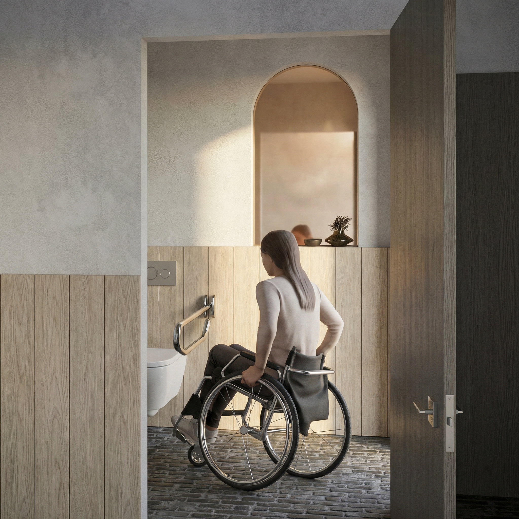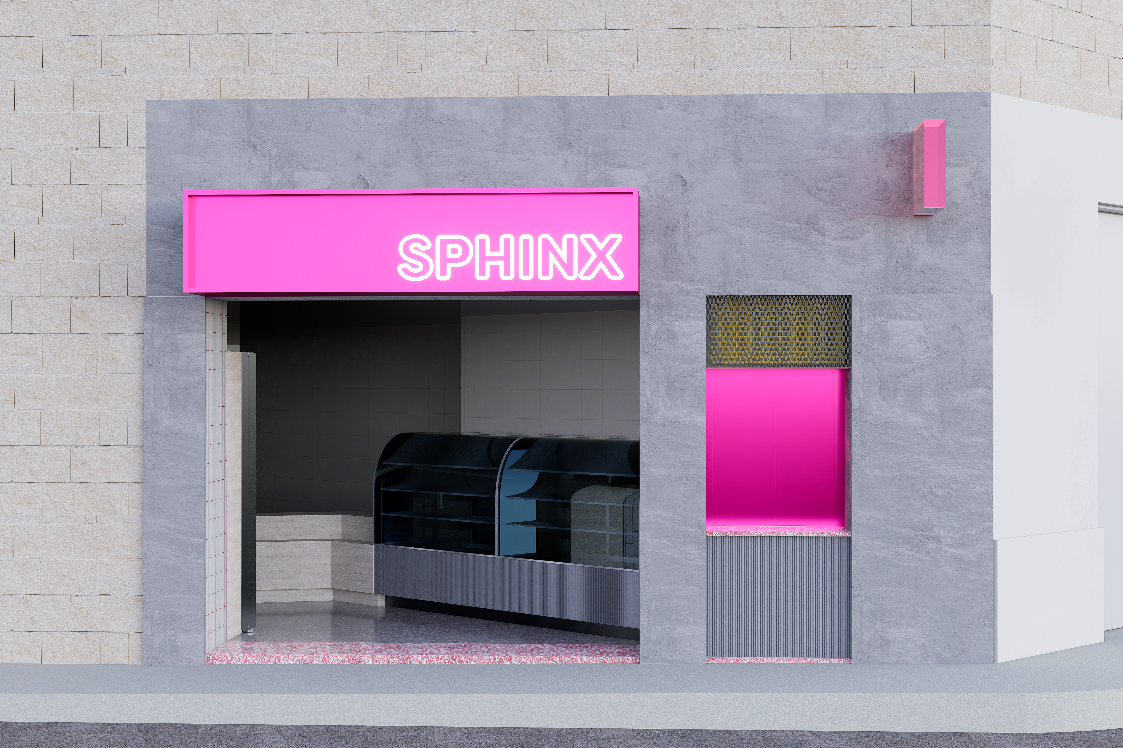 keep the exact geometry proportions openings and layout from the model with no changes main canopy box high gloss spray painted steel ral 4010 telemagenta smooth automotive finish corner box transparent telemagenta neon acrylic with inner glow walls light grey hand troweled cement render no seams or panel lines entrance portal glossy white rectangular tiles with pink grout on both jambs and soffit no black trim no exposed concrete no frame entrance floor polished pink terrazzo service window telemagenta reveal glossy black vertical timber slats below matte black chalkboards with white handwritten text no extra openings no panel seams no added frames no invented materials warm daylight realistic urban pavement no black trim around portal no marble no stone panels no concrete seams no added openings no matte pink no acrylic canopy no new shapes