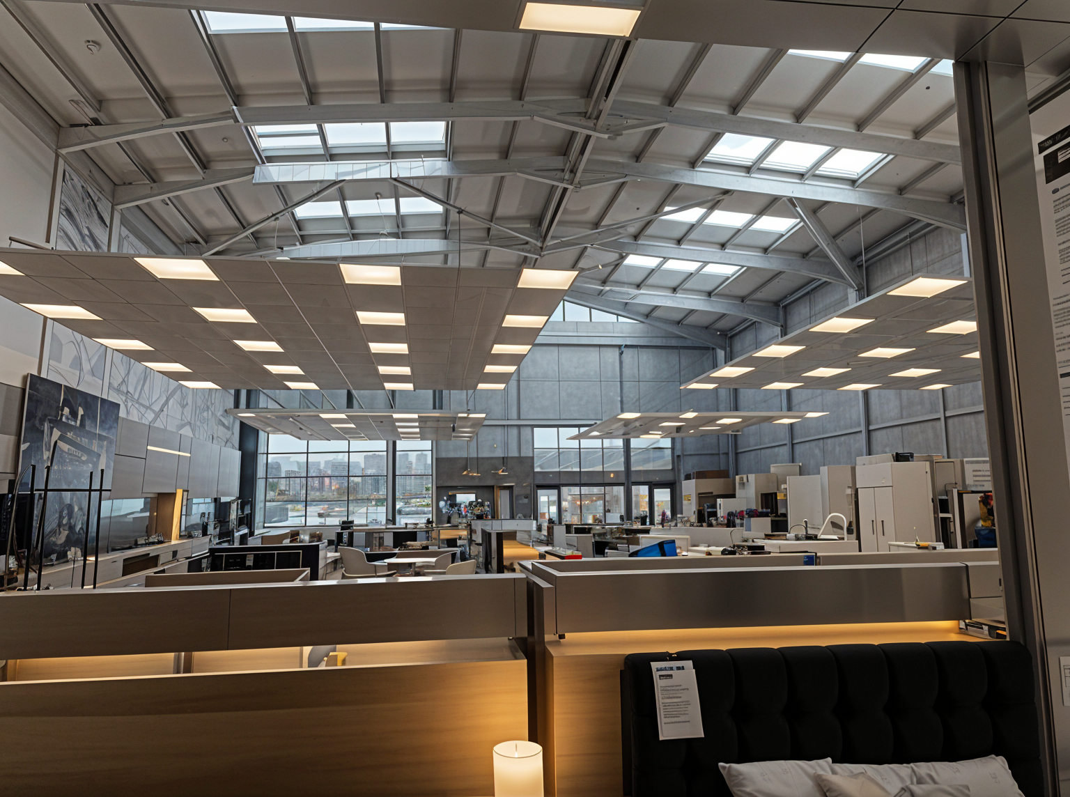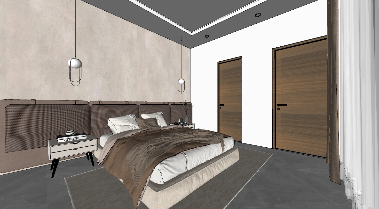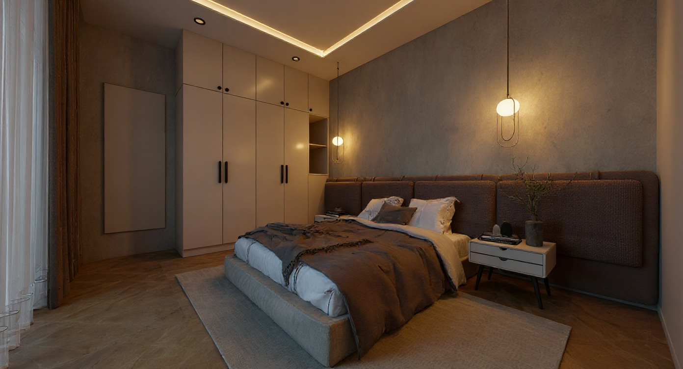create a realistic render provide cove lights and illumination for the light fixtures add artwork in the headboard wall