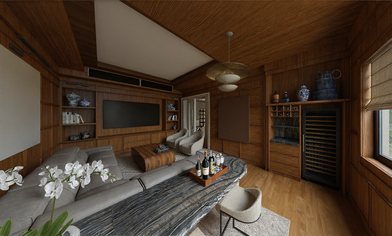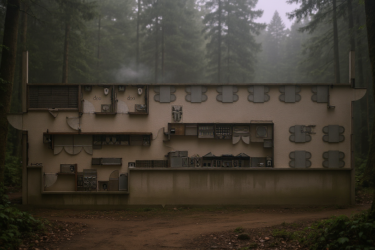 modernist exterior shot a beautifully rendered modern minimalist house set amidst a serene natural environment the house features angular wooden structures with a dark gray and black exterior large glass windows reflect the subtle hues of the surrounding landscape the wooden siding has warm earthy tones like soft browns and is combined with sleek contemporary black trimming the atmosphere is tranquil and the lighting is soft mimicking a gentle morning or late afternoon light the ground is adorned with patches of green moss and vivid yellow wildflowers adding a burst of color and life the surrounding trees are leafless drawn with delicate thin black lines indicating the late autumn season shadows of the trees create an intricate pattern on the house and the ground in varying shades of gray and brown the entire setting feels both modern and natural embracing simplicity and elegance architecture white facade keep windows from concept the background is forest please preserve the architecture and proportions of the building behind the building we have a slope and a forest