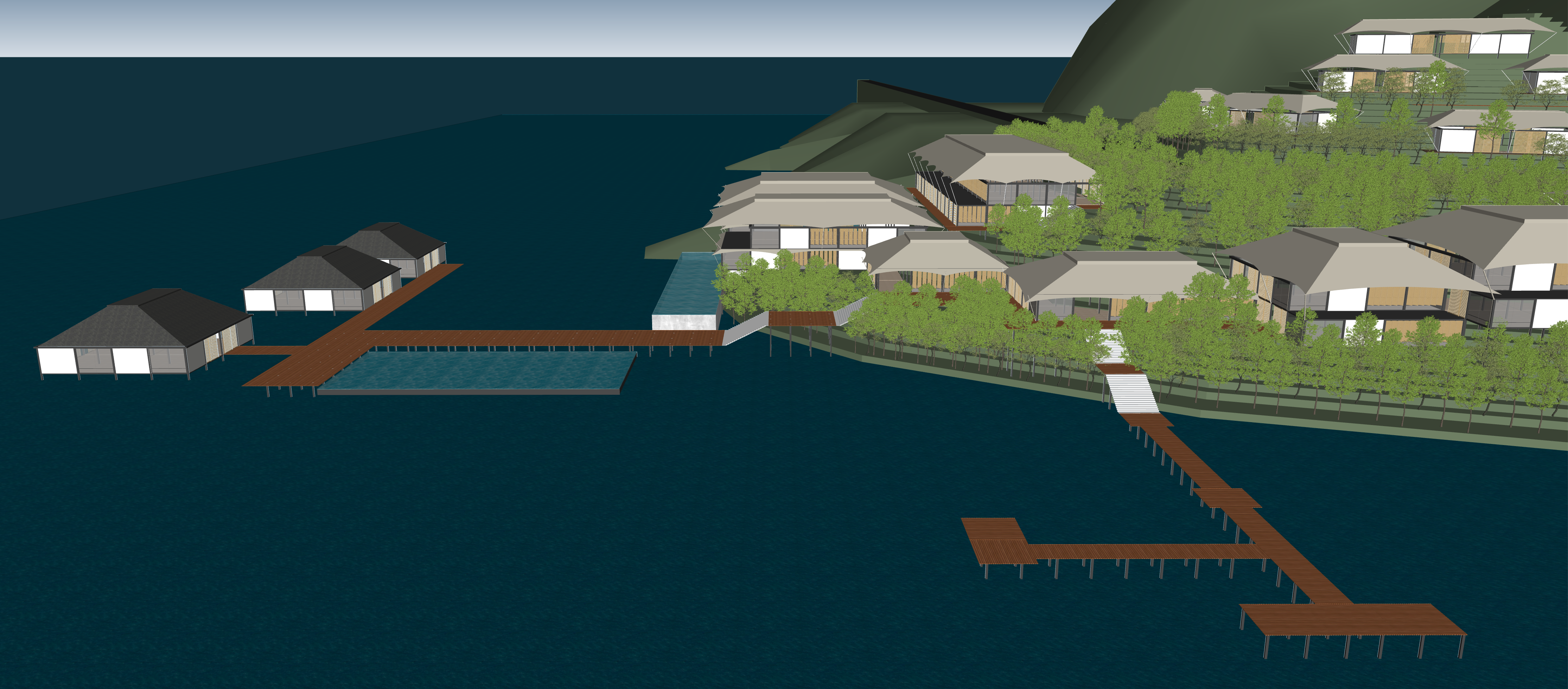 archsynth enhancement using the exact same viewpoint and unchanged 3d geometry render a romantic sunset mood glowing sky soft rim light outlining the tent roof warm ambient light filling the cabin and gentle reflections on wooden surfaces dense forest vegetation behind the cabin becomes warmly backlit creating a serene and intimate coastal hillside atmosphere