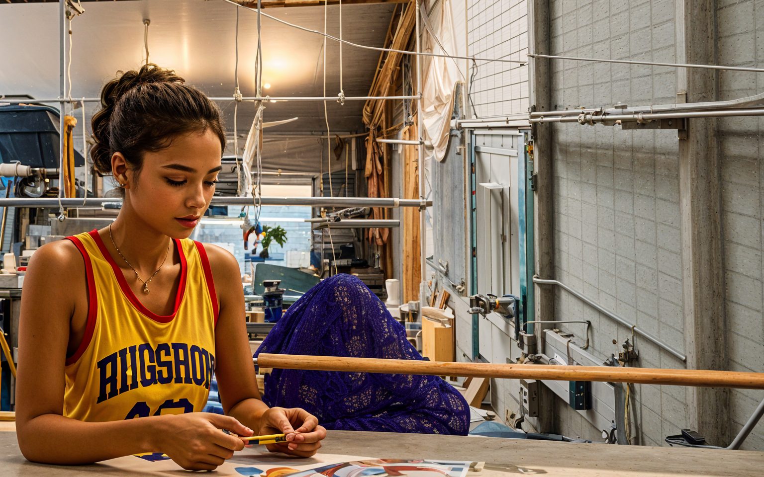 location is pacific palisades california late afternoon sunlight lighting in the space add grass in the yard outside add trees in the adjacent yards outside on the right side of the view add a woman sitting on the sofa the glazing mullions are anodized aluminum the glass on the left side of the view is clear glass looking to the outside at the second floor overlooking a garden at the yard level below the purple cylinder at the lower level is an acrylic glass jelly fish aquarium the interior walls are all white plaster add a boy playing with a dog in the yard outside make the jelly fish smaller in size and show more of them make the floor at the lower level below polished concrete add an area rug under the corbusier sofas in the living room below from design within reach dwr com add two men and a woman sitting on the corbusier sofas in the living room below having wine and cheese add a cat and a kitten walking on the floor below near the glass doors make the beams and columns anodized aluminum for the whole view