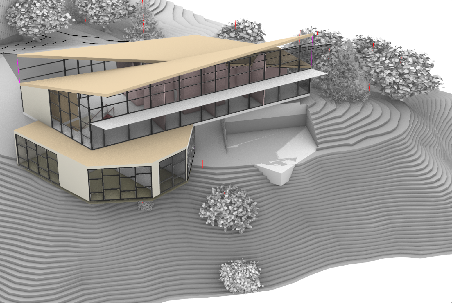 contemporary mountain research station architectural visualization sleek glass and metal panel fa ade with exposed steel framing perched in alpine landscape surrounded by evergreens and lots of trees with rugged rock formations midday sunlight crisp blue sky high contrast reflections on glass warm tones detailed environmental integration realistic materials and lighting cinematic composition archsynth style ultra detailed architectural rendering 8k photorealistic