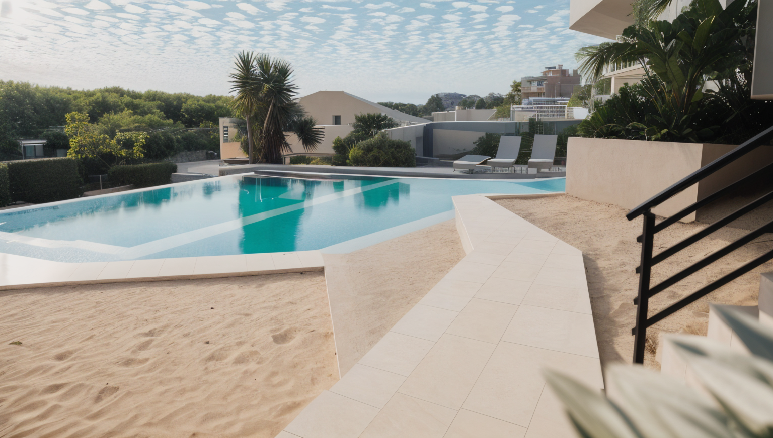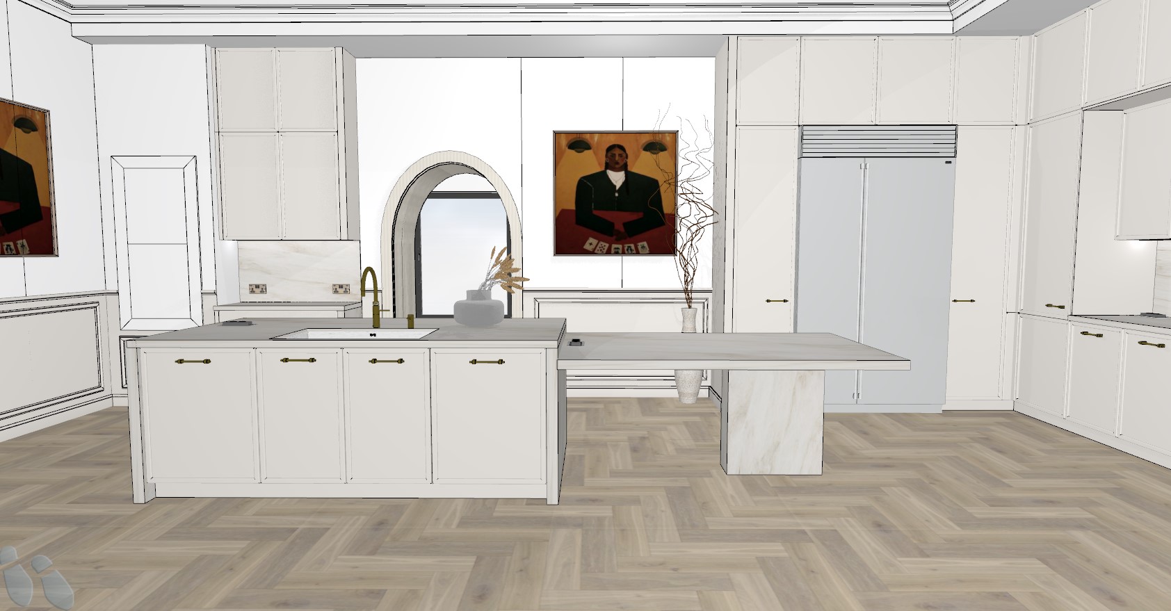 modern kitchen interior spacious and elegant featuring a white quartz with sparkle island with soft grey veins cabinets are sleek tape with subtle brass hardware the floor showcases a light grey oak herringbone pattern warm ambient lighting from a large fabric pendant lamp creates a cozy atmosphere with beautiful natural lighting walls and ceiling are soft ivory enhancing a sense of openness a delicate vase with dried twigs stands near a classic wooden door adding a rustic touch the atmosphere is inviting and sophisticated perfect for a luxurious modern home extractor feature in light white oak