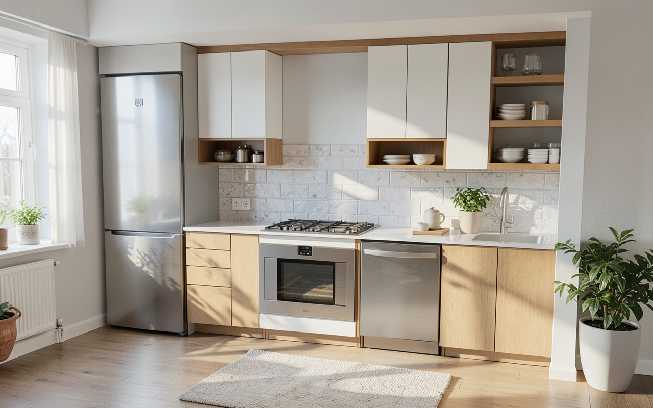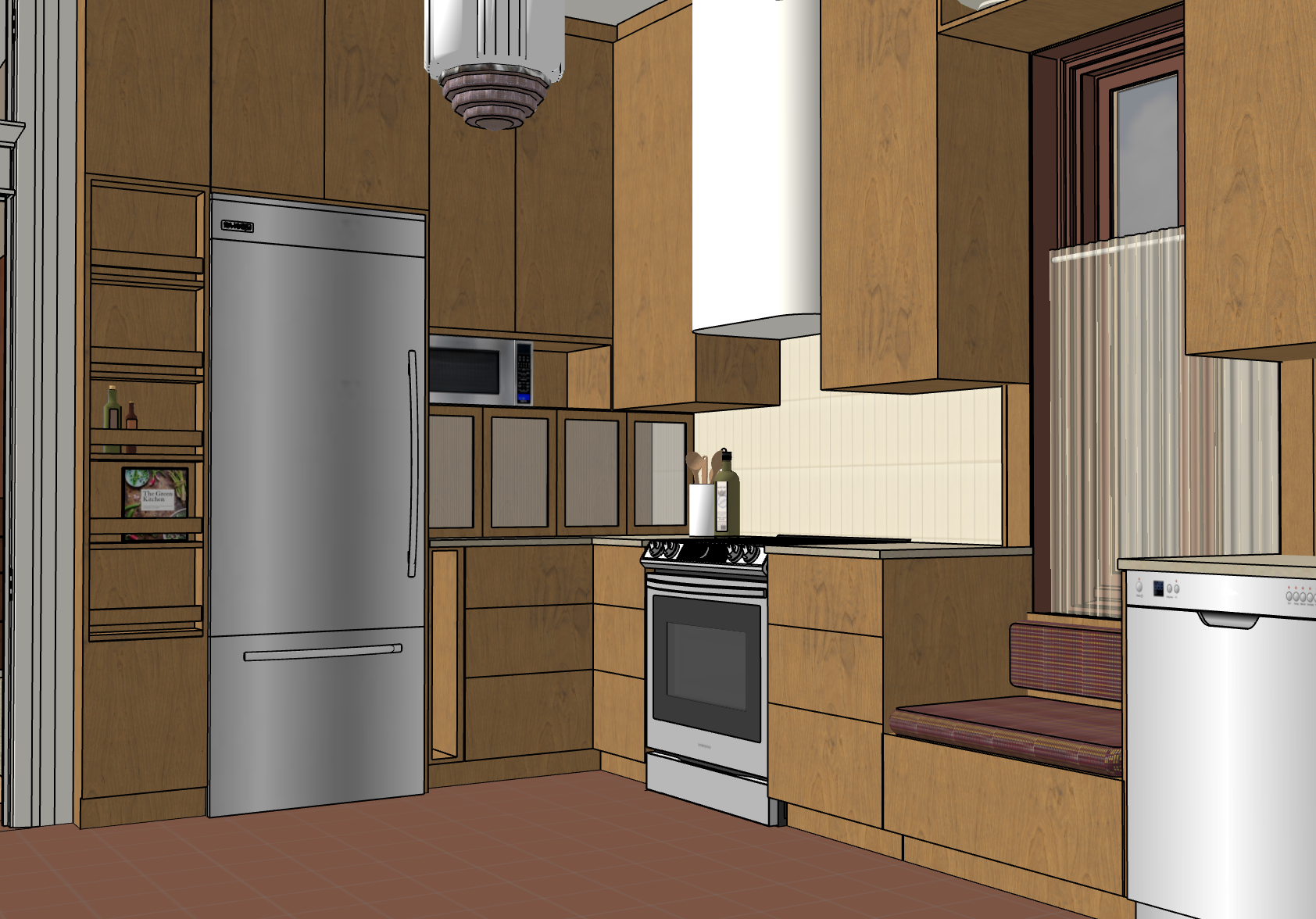 render the 3d model provided exactly as it is show only the geometry surfaces and materials from the uploaded file include lighting and shadows as per the scene maintain the current furniture walls and floor exactly as modeled do not add plants trees people humans windows not in the model decorations lamps curtains extra furniture or any elements not present in the uploaded file illuminate pendant light add reeded glass to cabinets beside fridget that are currently white