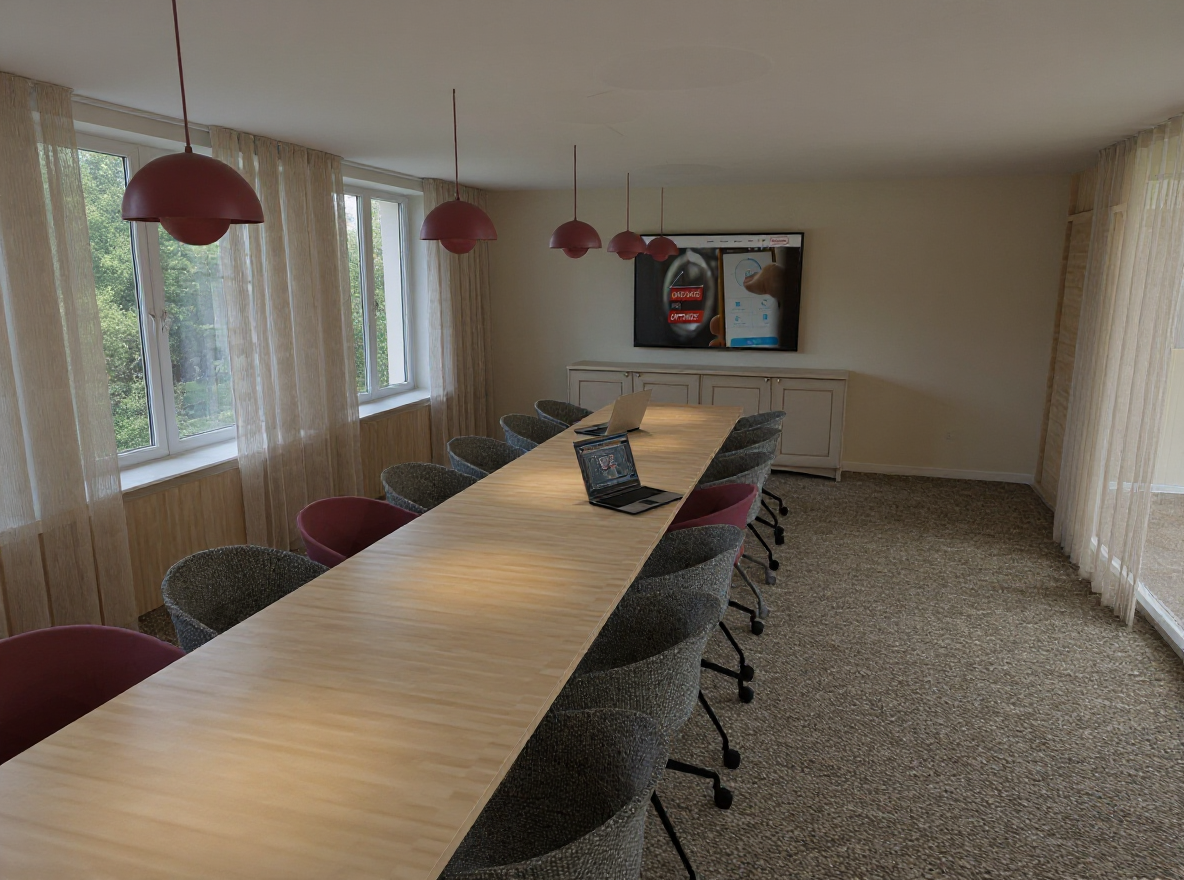 make it more realistic the view is a city view from stockholm close to the central station keeep the size of the windows as they are and with the oak panel in front make it a bit brighter with som light on the table from the lamps ans on the wall with the tv please