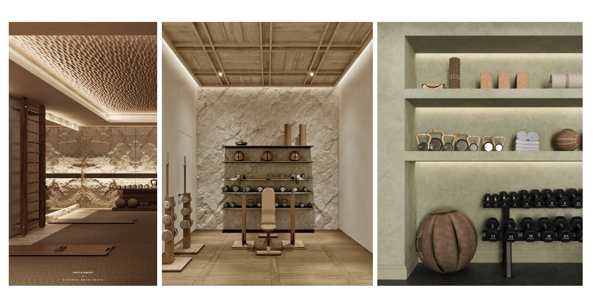basement gym with a mediterranean aesthetic stone freeform rock cladding timber floor timber tones weights and equipment built in wall niches used as shelving for equipment