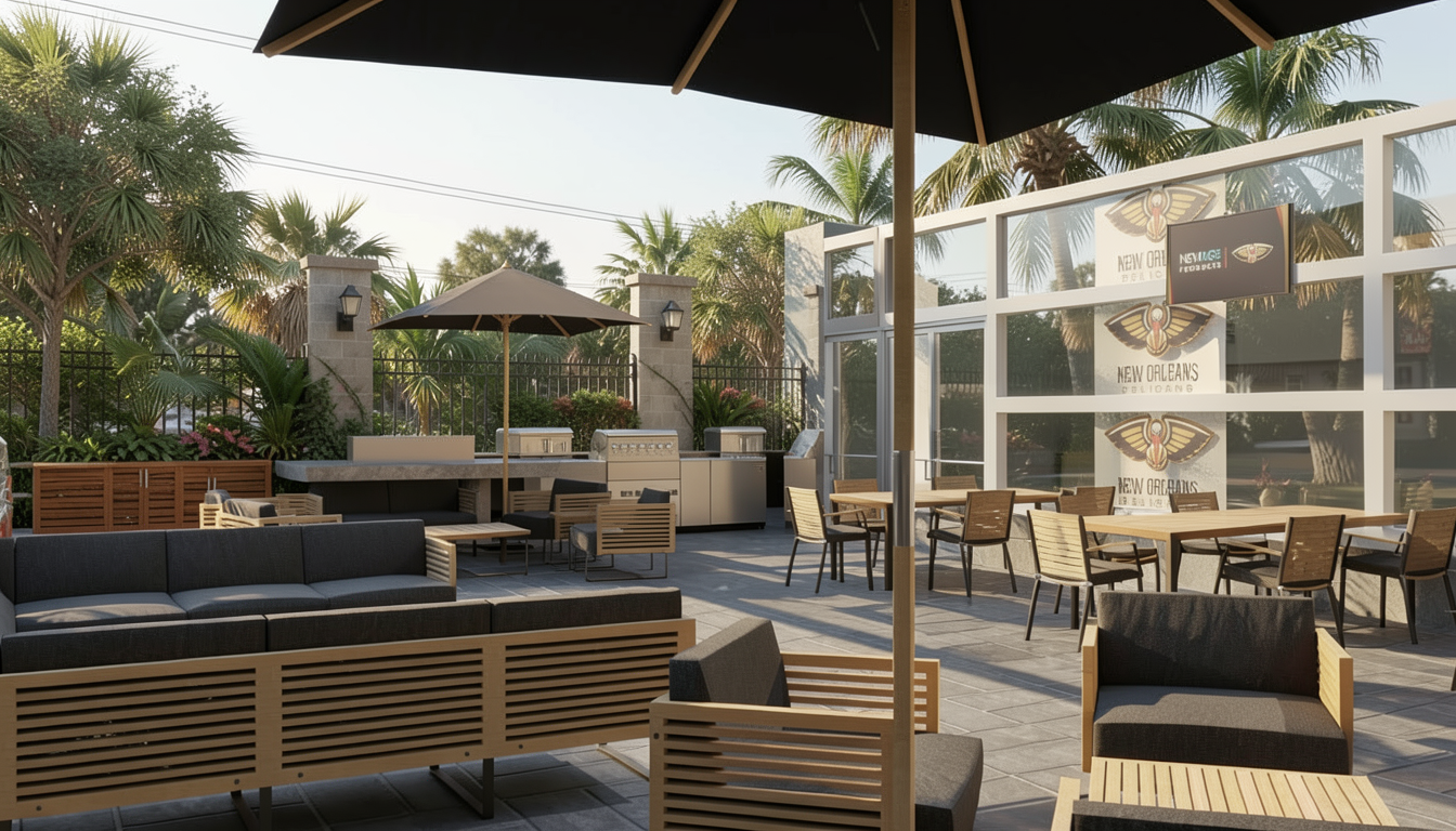 make this render look like a real live photo add new orleans vegetation behind the fence and be careful not to put any inside also give depth and continuation above the windows make them dark windows too put part of a small concrete metal building above the windows
