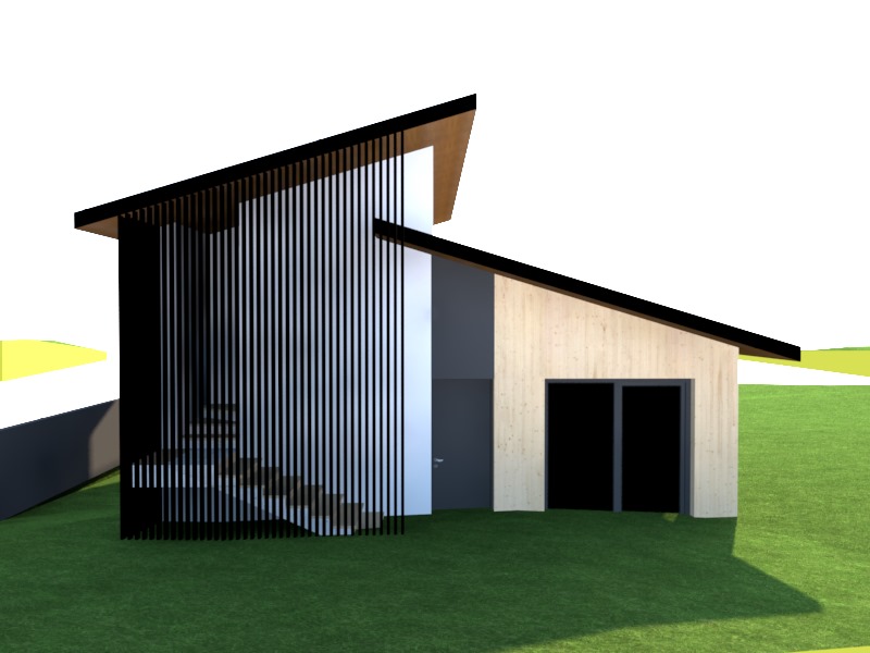 render a modern minimalist house with a unique slanted roof design use a light grey facade with natural wooden panels on the right side adding warmth incorporate sleek black vertical accents on the left for contrast create a lush vibrant green lawn for the foreground with a clear crisp blue sky above adding tranquility aim for an open airy atmosphere capturing soft sunlight casting gentle shadows enhancing the architectural lines and emphasizing the clean contemporary aesthetic