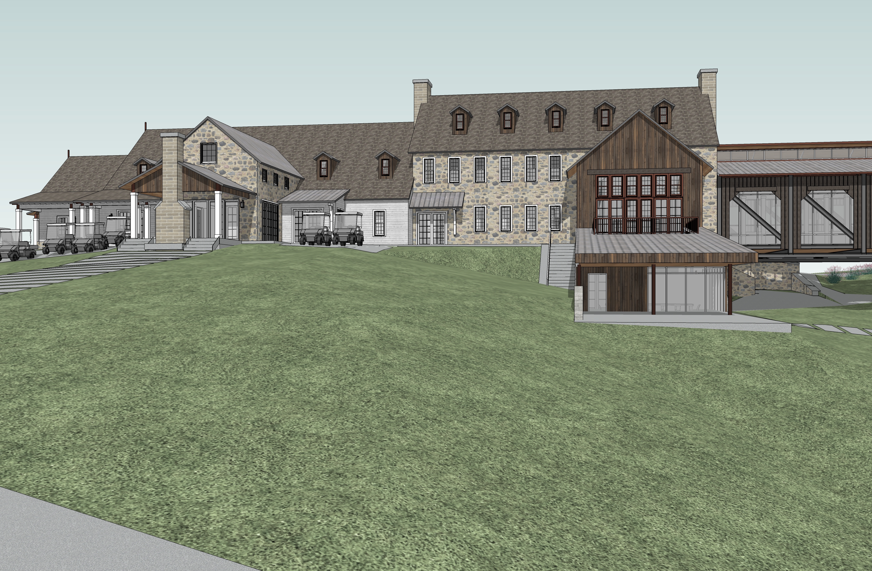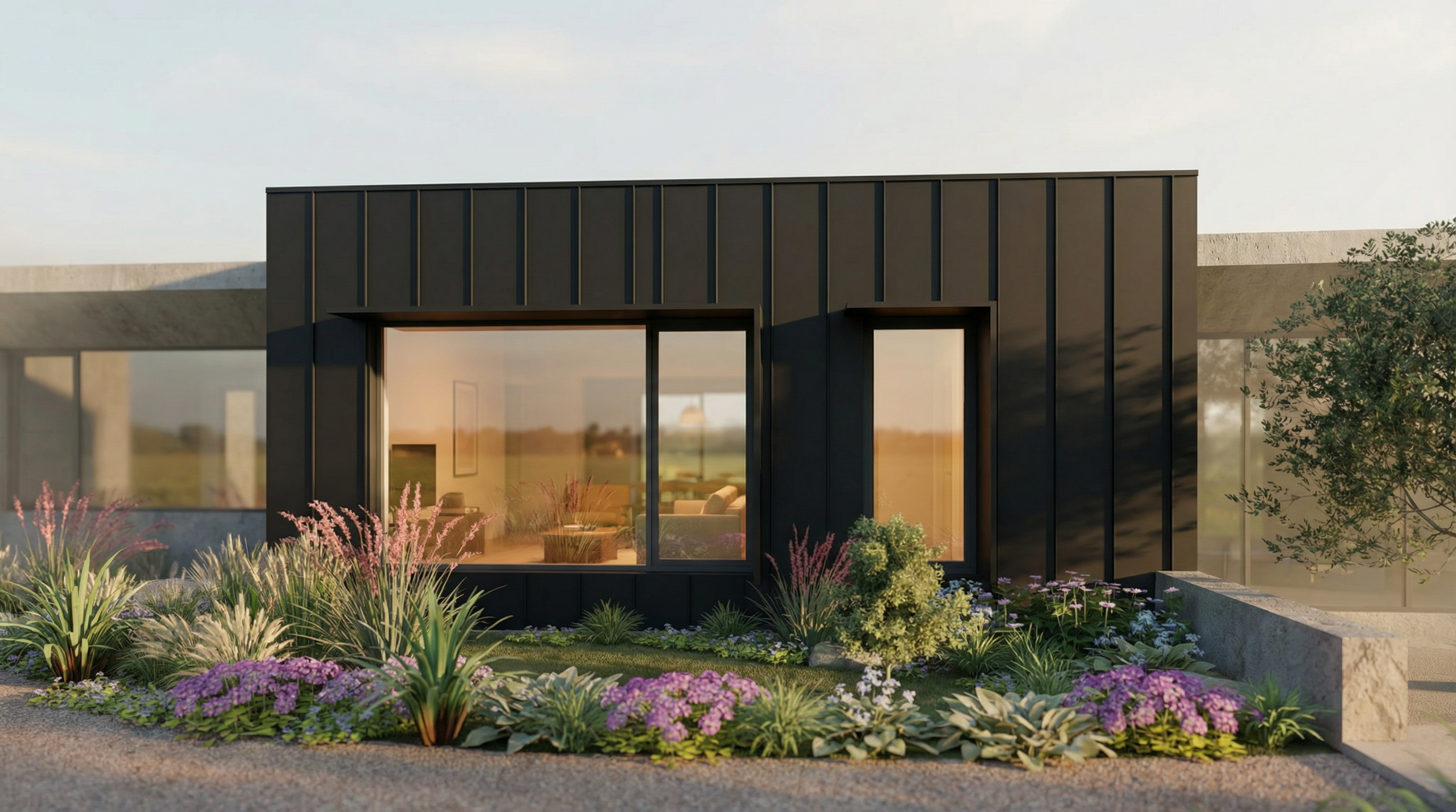 industrial design mill house with vertical matte wood shiplap steel bridge with wood slats old stone farmhouse with carriage house attached tall grass foreground trees in background sunlight on building face fog