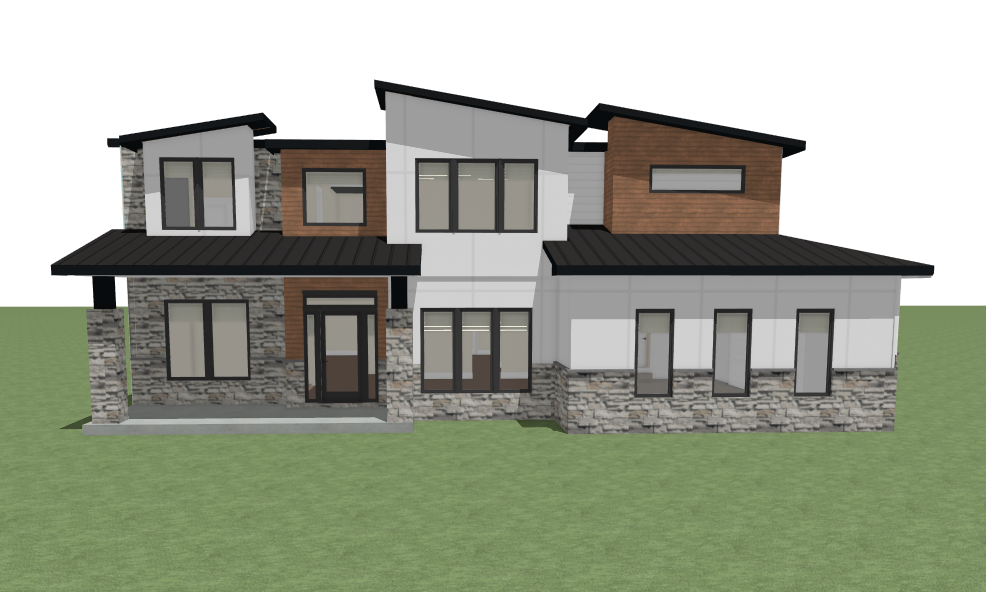 render this 3d image to appear photo realistic maintain all existing architectural materials and structural elements exactly as shown enhance the setting with a lush well maintained landscape include minimal beds manicured shrubs and a tree lined backdrop that frames the home naturally the windows should have a glossy finish with clear reflections of the surrounding trees and sky lighting should feel natural with soft shadows and realistic depth to bring the scene to life
